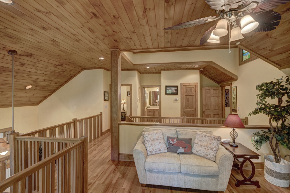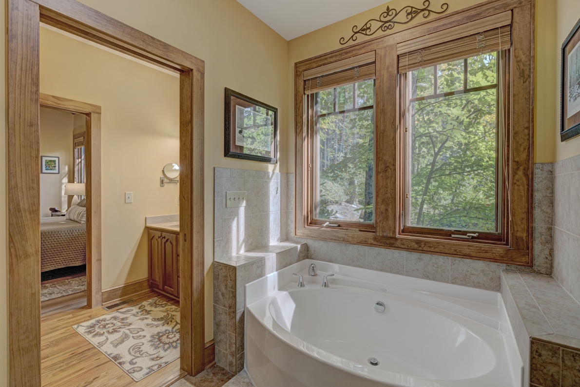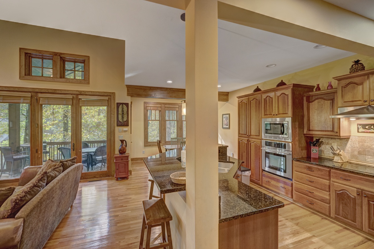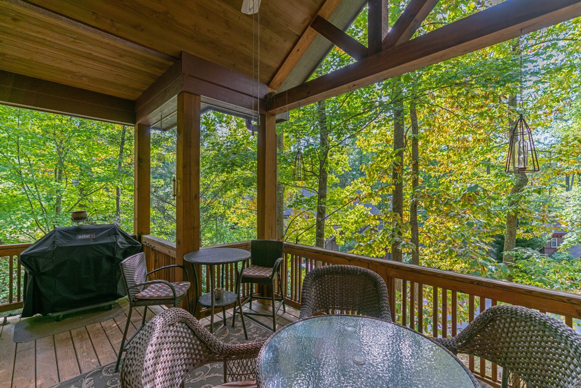 Description: This luxury townhome with modern décor has all the upgrades starting at the entryway and continuing throughout the unit and outside onto the deck with 3 bedrooms, 2 ½ baths and a garage. The entry way is inviting with a beautiful stained-glass window. Hardwood floors are throughout the townhome with tongue and groove vaulted ceilings in the living room, primary bedroom and loft area. The colors throughout the townhome are warm and soothing like the mountains themselves. The kitchen, dining, and living room areas have an open floor plan with lots of light coming in from the picture windows. The kitchen is upgraded with dark granite countertops, tile backsplash, custom built cabinetry, all stainless-steel appliances including a built-in oven and microwave, built-in glass-top stove, and a wine cooler. The kitchen is fully equipped with everything needed to prepare meals. The dining room table is large enough for 8 people and the kitchen bar serves as additional seating when needed. The living room is comfortably decorated and features a floor to ceiling stone fireplace with gas logs; flat screen television, and large windows making guests feel like they are in a treehouse. The deck can be accessed from the living room area. The deck is nicely done with a large outdoor rug, wicker furniture including a table and chair and bistro set. For guest’s convenience, a gas grill is also provided. The main floor also features the primary bedroom and bathroom. The primary bathroom extends off of the primary bathroom with “His” and “Her” sinks, a tiled shower, and a relaxing large soaking tub. The main floor also has a half bath and laundry room. The stairs at the entryway take you to the loft area and the two other bedrooms and bathroom. Another beautiful stained-glass window can be admired here. The loft area provides an extra seating room and another place for guests to relax and read a book or watch television. The bedrooms upstairs each have queen size beds and one has a futon providing additional sleeping space.