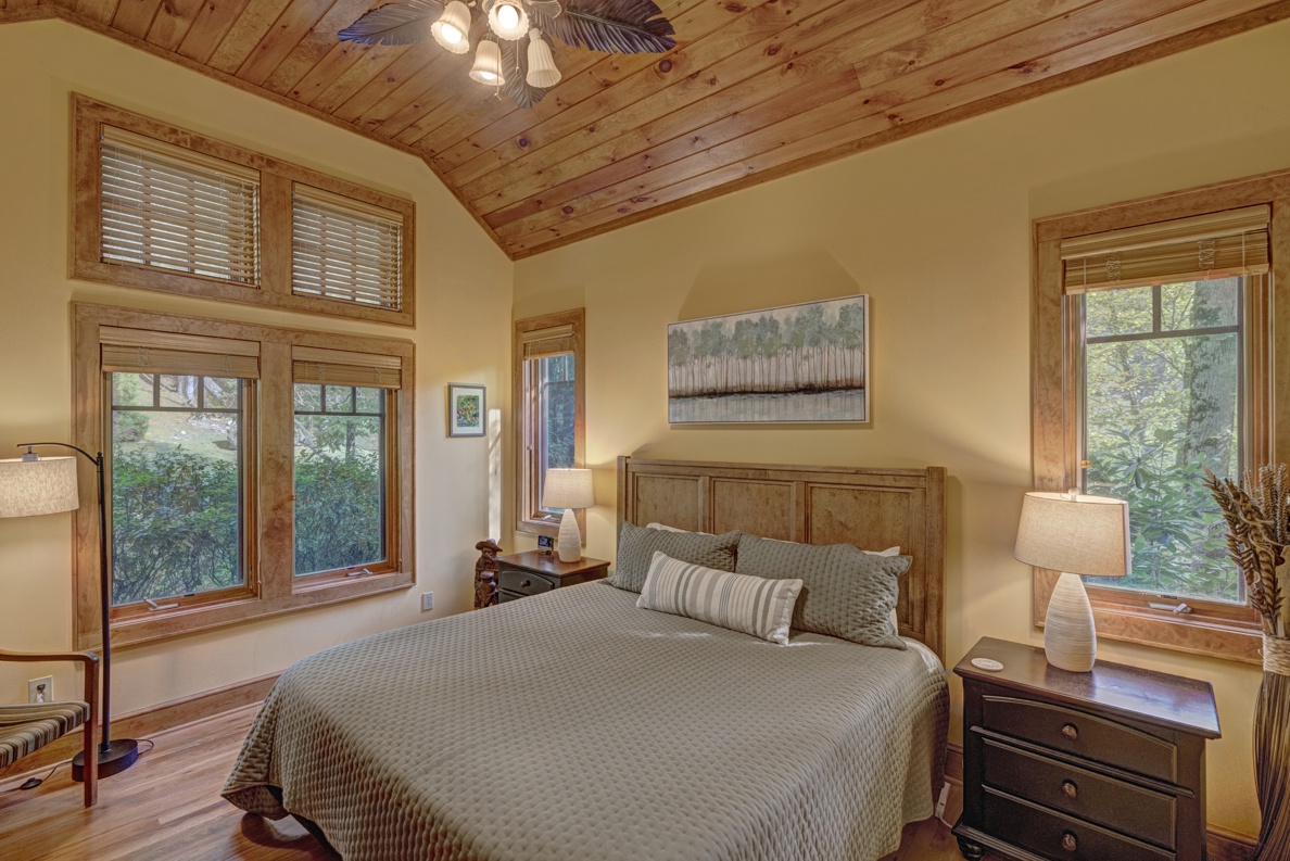 Bed Configuration: King (Primary Bedroom, Main Floor), Queen and Full Futon (Guest Bedroom, Upstairs), Queen (Guest Bedroom, Upstairs), Sleeps 7