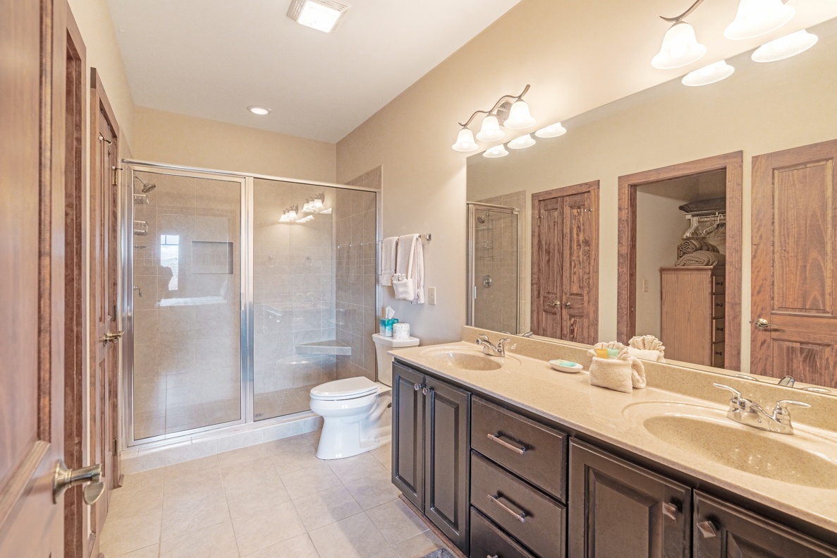 Primary Bathroom---Double Sinks, Tile Shower Stall