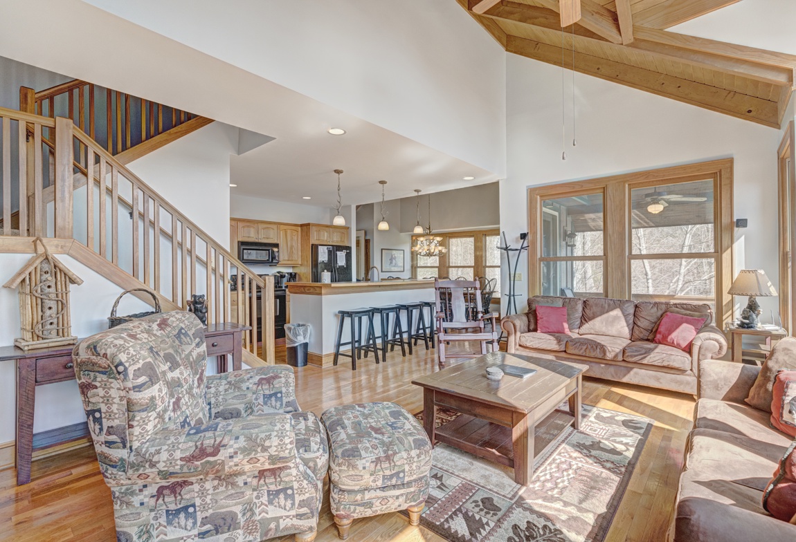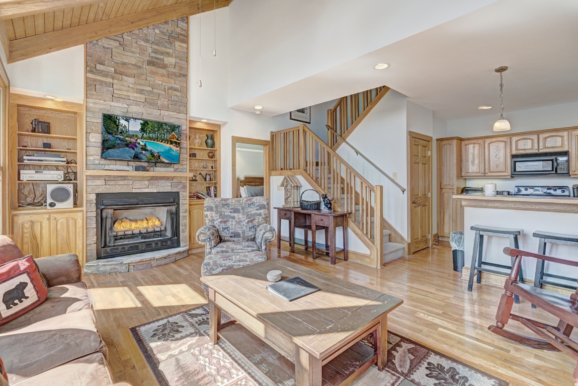 Living Room--- Cozy Fireplace, Vaulted Ceilings