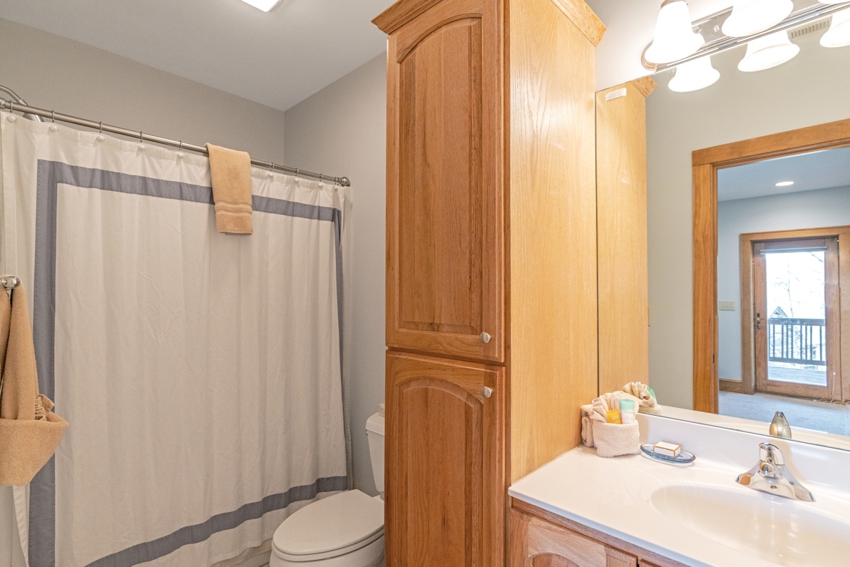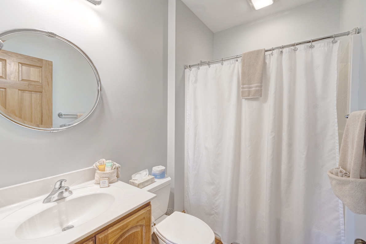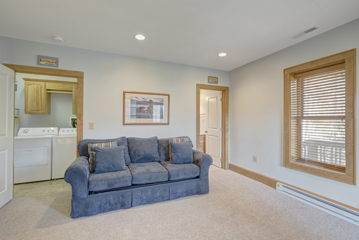 The primary bedroom, conveniently situated on the main floor, features a king bed, a spacious soaking tub, and a separate shower for a luxurious experience. The main floor guest room boasts a queen bed with a full bath. Upstairs, a charming bedroom awaits with a queen bed and bunk beds featuring a twin on top and a full bed below. The downstairs den/bedroom, complete with a sleeper sofa, provides privacy with its own en-suite bathroom.