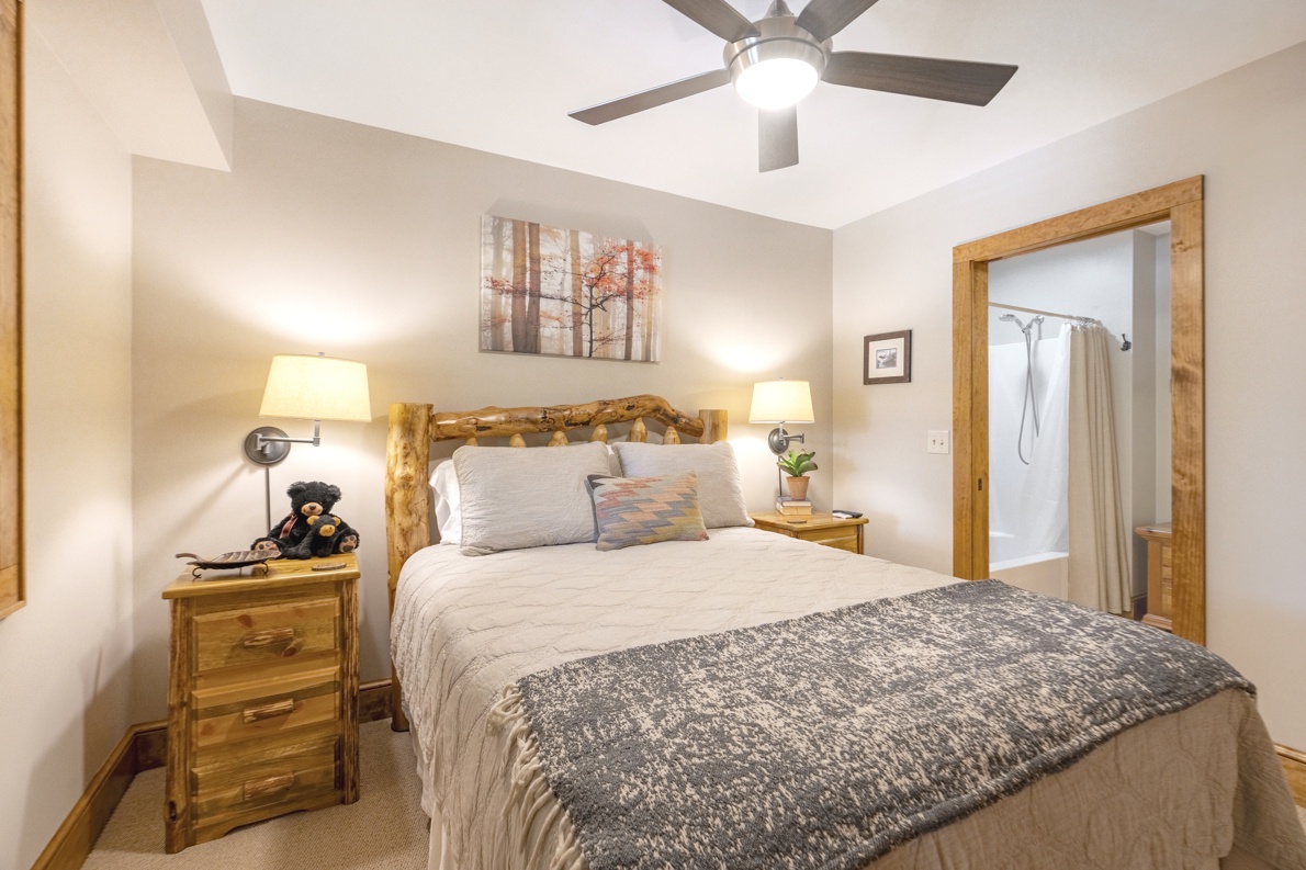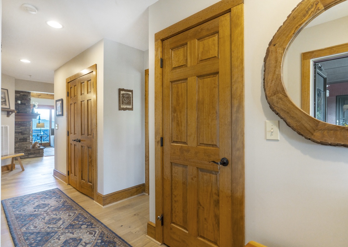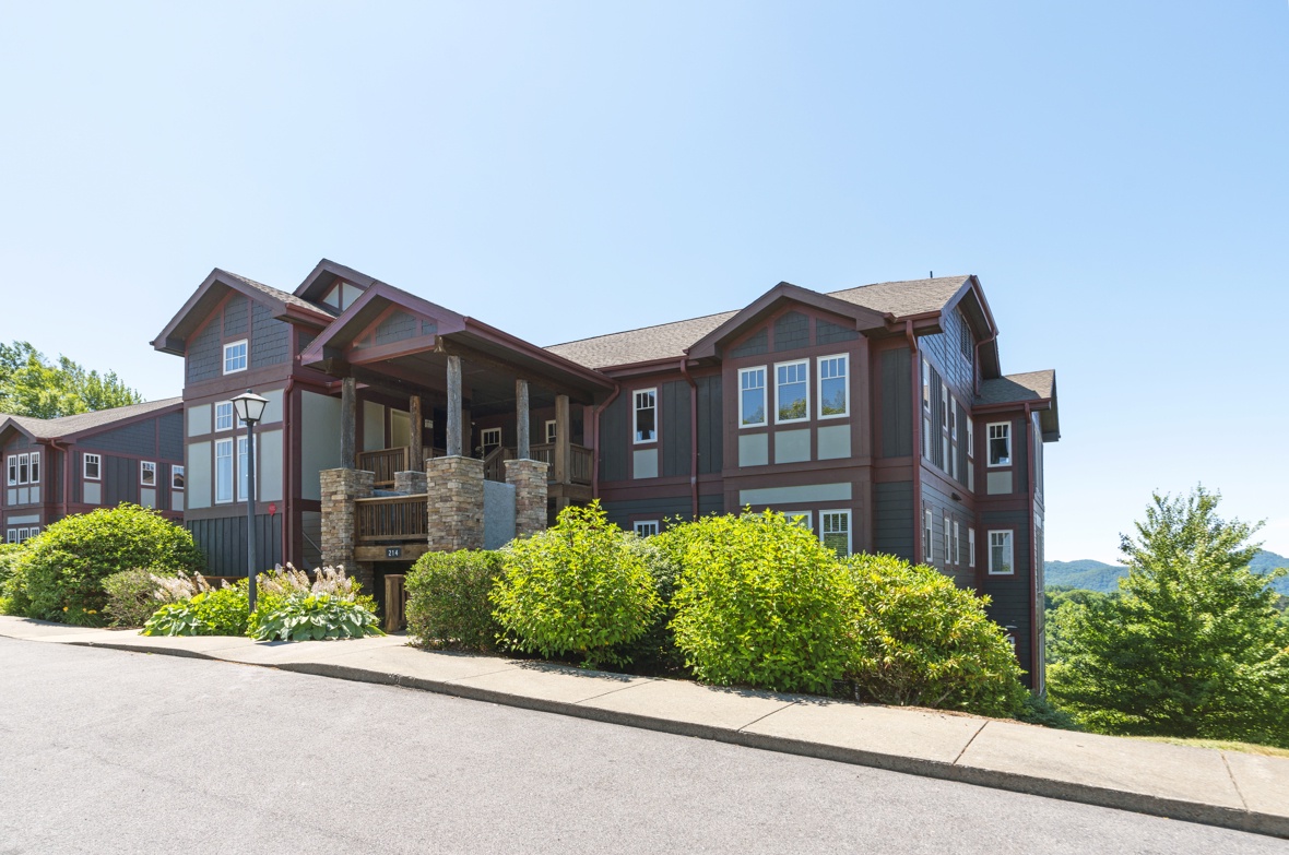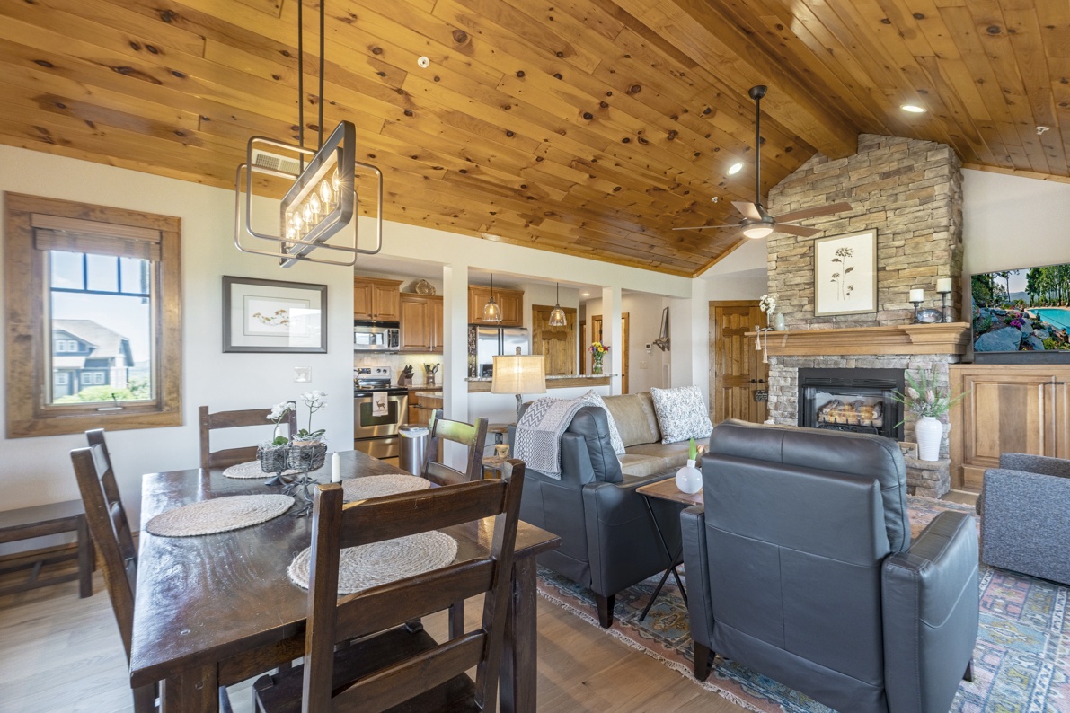Description: The Grand Oaks floor plan features convenient single level living with 3 bedrooms and 3 bathrooms, elevator access, and a covered entry. The open floor concept has a spacious 1669 square feet with cathedral ceilings in the living and dining areas as well as the primary bedroom. Mountain views can be admired from the open kitchen, living and dining room areas as well as the primary bedroom. The kitchen boasts custom cabinetry and is equipped with everything to prepare a meal. Enjoy a meal at the dining room table, play cards or put a puzzle together. Cozy up in the living room in front of the gas log fireplace or enjoy your favorite movie. The choices are yours! The large 19 ft wide covered concrete deck is a place to gather with friends or enjoy a quiet afternoon enjoying the wonders of nature and the breathtaking mountain view. The spacious primary bedroom and bathroom suite offers a luxurious experience and access to the deck area as well as the living room. The guest bedrooms also have bathrooms offering privacy for each guest. Come for a short weekend or enjoy an extended stay and explore all the High Country has to offer. This condo is on the top floor (upstairs, no condos above) with an elevator. In case of power outages or elevator equipment malfunctions, the condo will be stair access only.