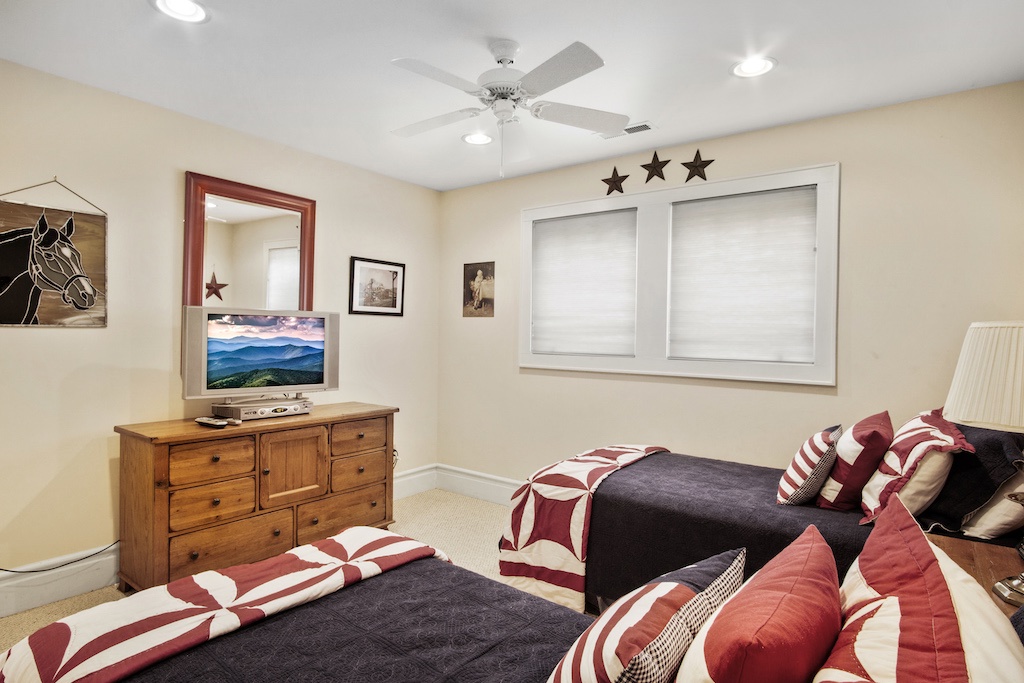 Ascending upstairs reveals two more bedrooms, one featuring a queen-sized bed and the other with two twin beds. An additional bathroom on this floor adds convenience to the living spaces. Downstairs, another living room space awaits, equipped with a TV for entertainment, along with a bathroom and a bedroom featuring a queen-sized bed. A TV is also thoughtfully placed in the main floor's primary bedroom.