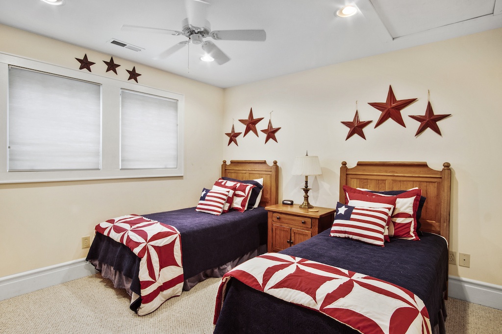 Bed Configuration: King (Primary Bedroom, Main Floor), Queen (Guest Bedroom, Upstairs), 2 Twins (Guest Bedroom, Upstairs), Queen (Guest Bedroom, Downstairs), Sleeps 8