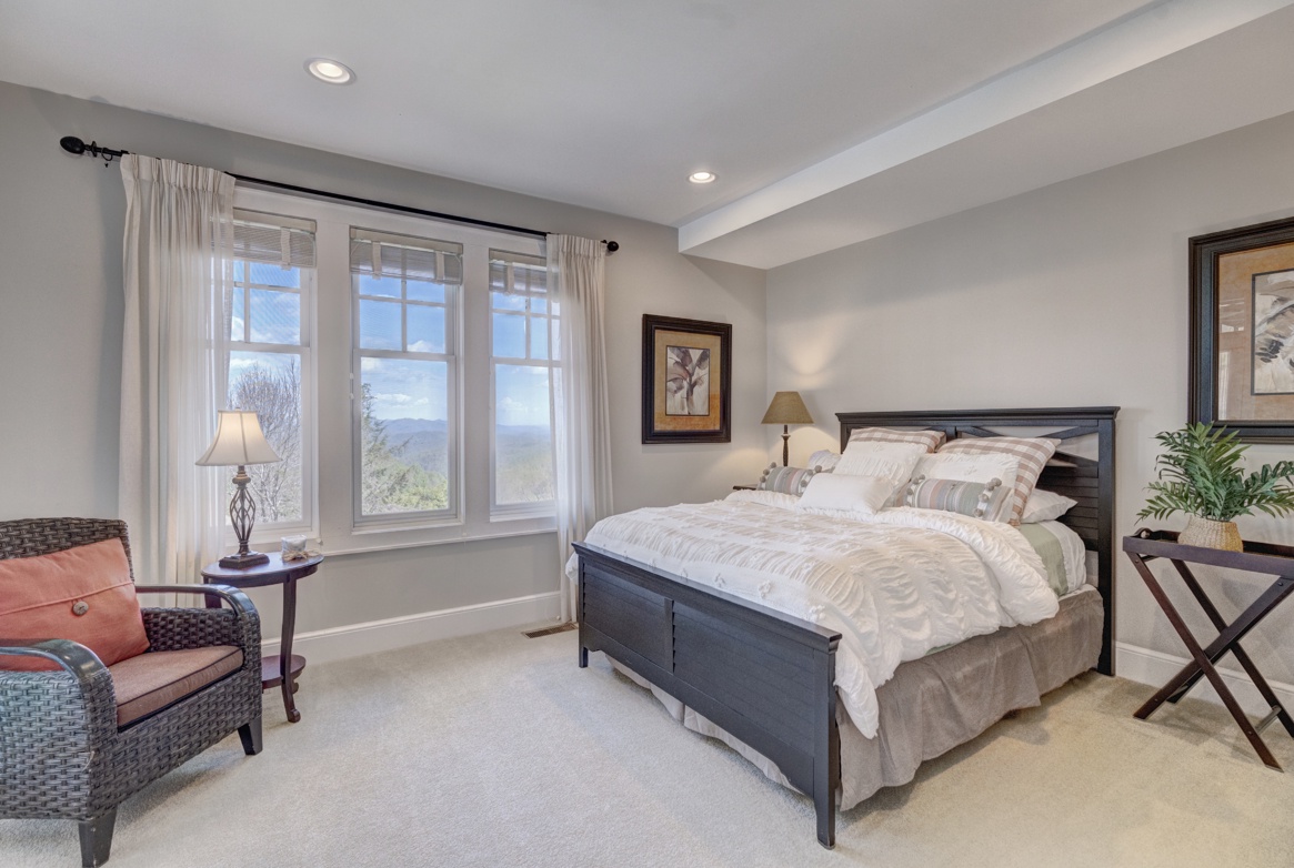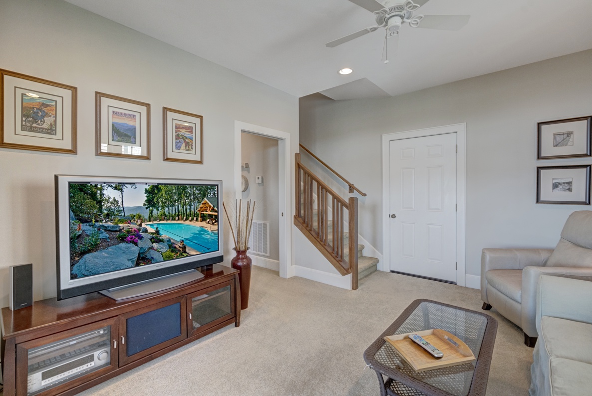 The lower level is a haven of relaxation, featuring a sitting room with a 50-inch surround-sound TV, a full bath with a hairdryer, and a bedroom with a queen-size bed, a comfortable chair, and an ottoman. Step out onto the deck to find sectional seating and a new gas fire pit, providing the perfect setting to savor more awe-inspiring long-range views. Conveniently located near the clubhouse and seasonal outdoor pool (open May 1 - Oct. 1), Townhome R5A offers an unforgettable mountain retreat.