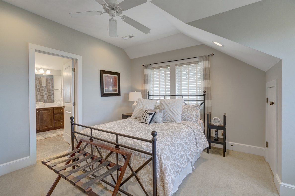 Venture to the upper level, where two bedrooms share a Jack and Jill full bath, equipped with a hairdryer. One bedroom features two full-size beds, while the other boasts a queen bed and a convenient writing desk.