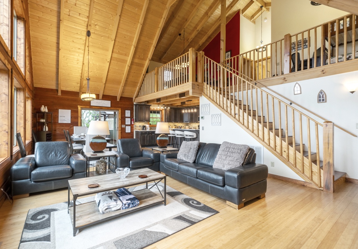 Bed Configuration: King (Primary Bedroom, Main Floor), Queen (Guest Bedroom, Upstairs), Queen (Guest Bedroom, Upstairs), Twin Bunk Bed with Twin Trundle (Open Loft, Upstairs), Sleeps 9