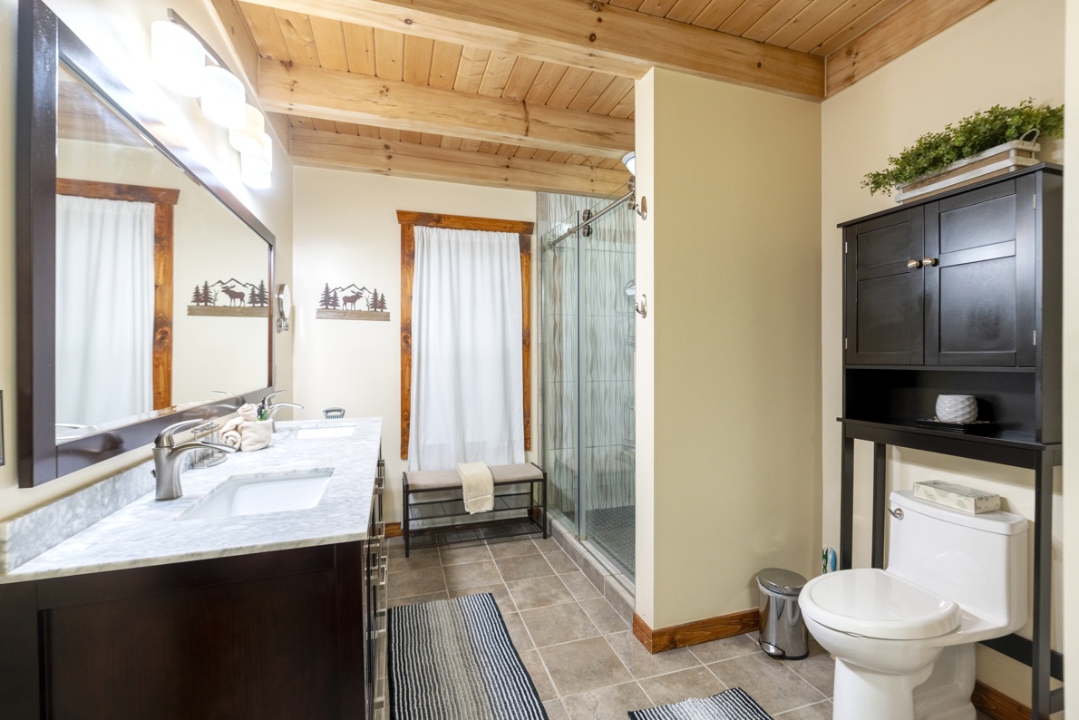Retreat to the luxurious master suite, featuring a sumptuous King bed and access to the expansive deck, offering a serene outdoor sanctuary. Pamper yourself in the opulent ensuite bathroom, boasting exquisite granite countertops, dual vanities, and a spacious tiled shower.