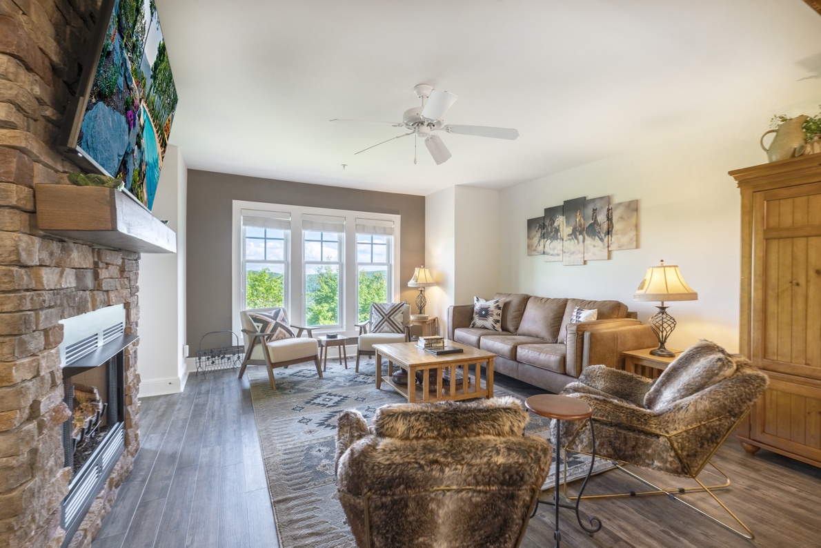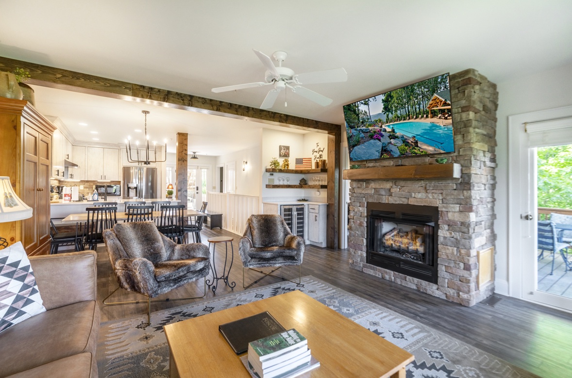 Living Room--- Cozy Fireplace, TV, Mountain View