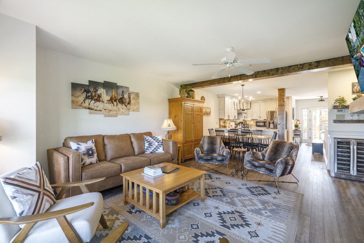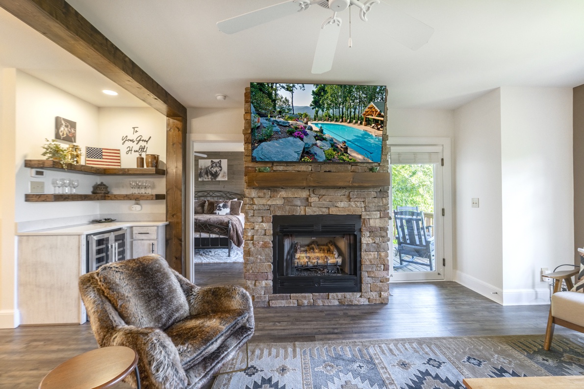 Living Room--- Cozy Fireplace and TV, Wine Cooler