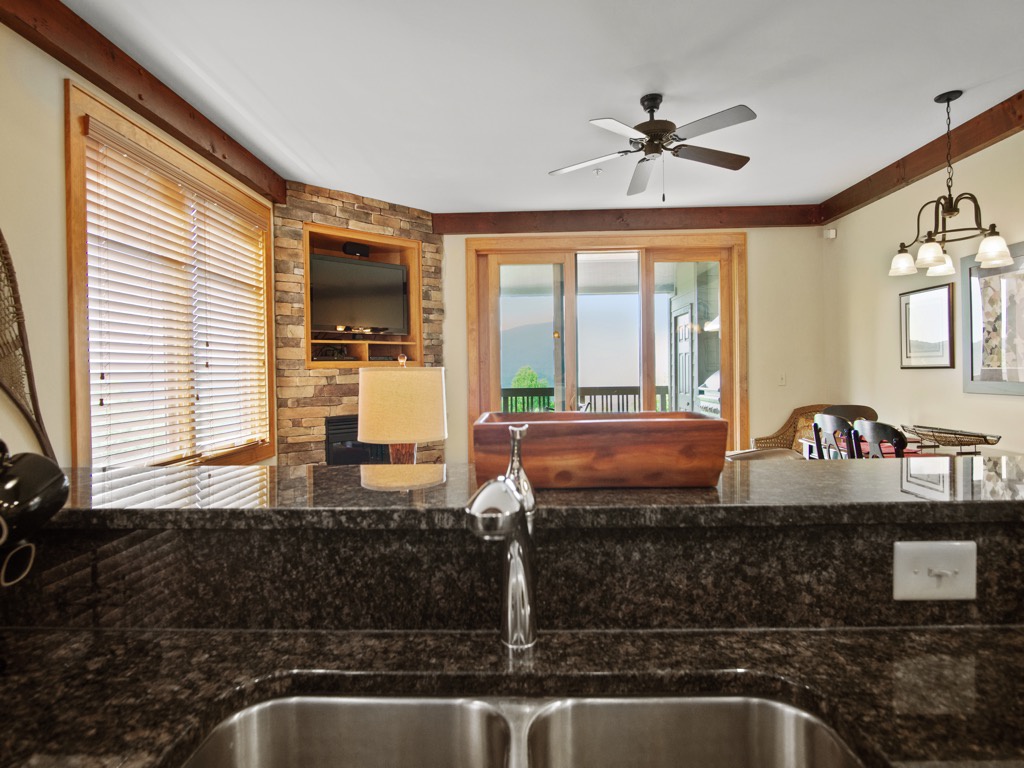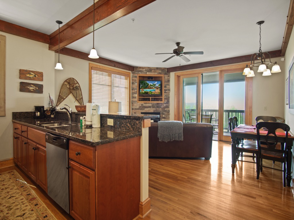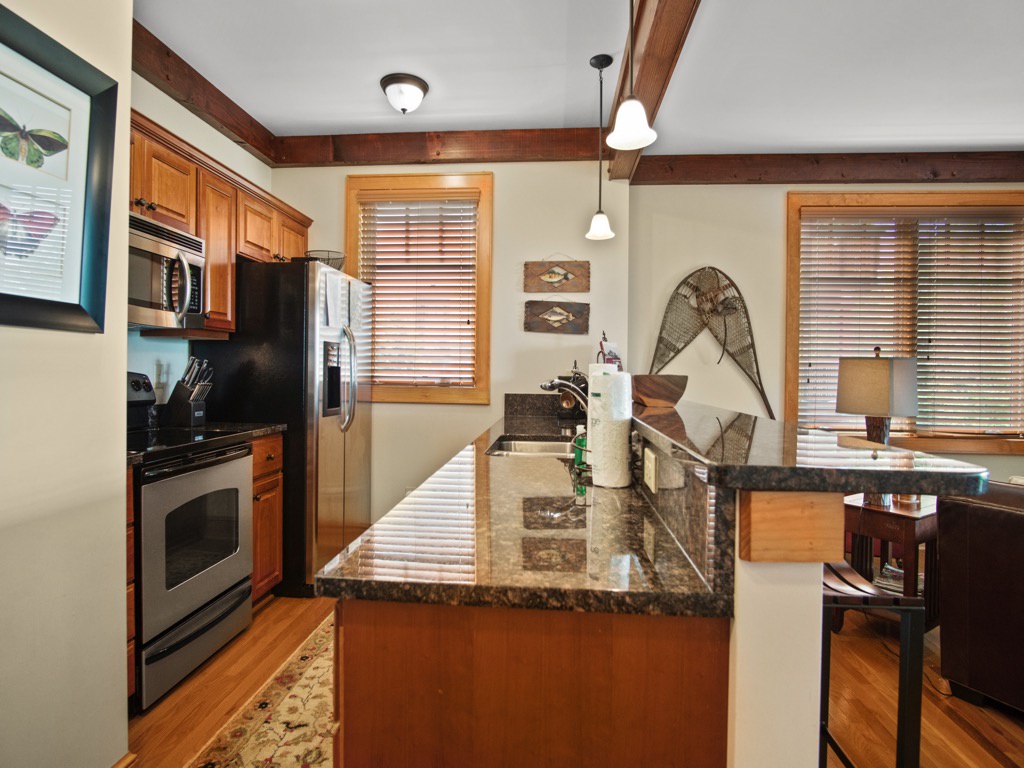Description: Enjoy a beautiful view of mountain living from this rugged timber frame one bedroom condo located in Chalakee, within Echota Resorts. This condo features a covered front entry and rear deck with an amazing Grandfather Mountain view. The view can be admired from the deck or from the large picture windows in the open kitchen and living room areas. The kitchen features custom kitchen cabinetry, granite countertops, hardwood floors, and stainless-steel appliances. It is fully equipped with everything to prepare a meal inside or outside on the built-in-gas grill. The living room is cozy and inviting with a cultured stone gas fireplace, hardwood floors, comfortable furniture and a TV. Stay for a weekend to relax or an extended period and enjoy all the High Country has to offer. This condo is on the bottom floor (downstairs) with an elevator. In case of power outages or elevator equipment malfunctions, the condo will be stair access only.