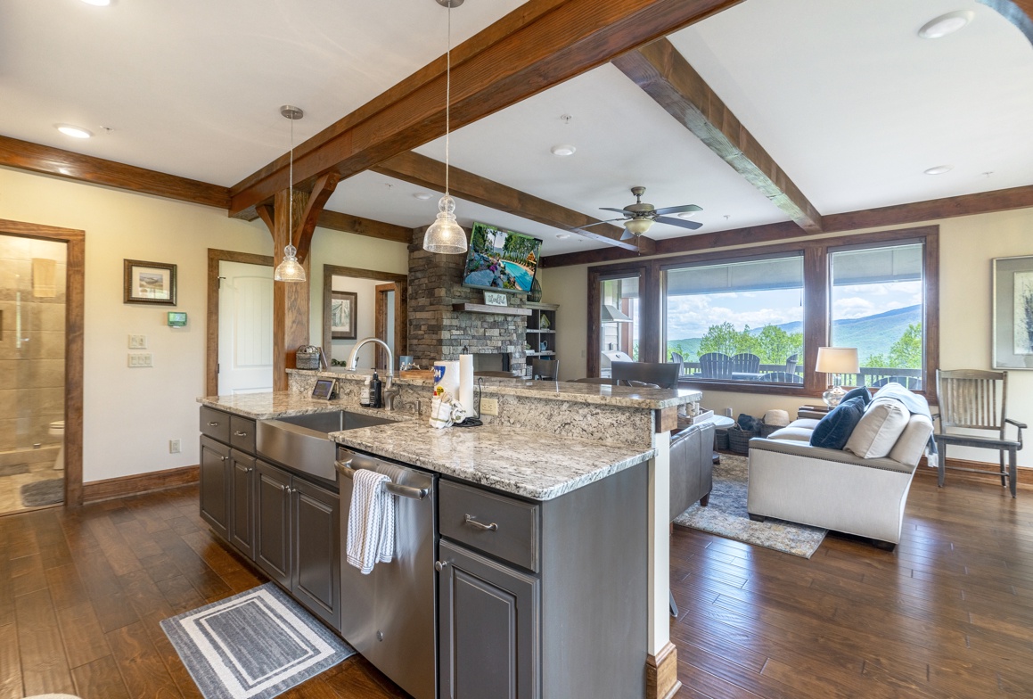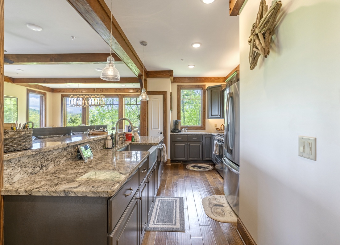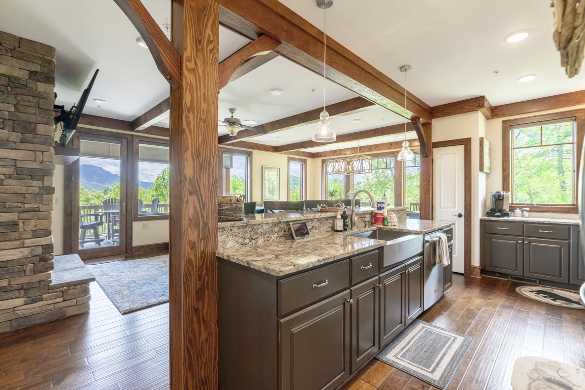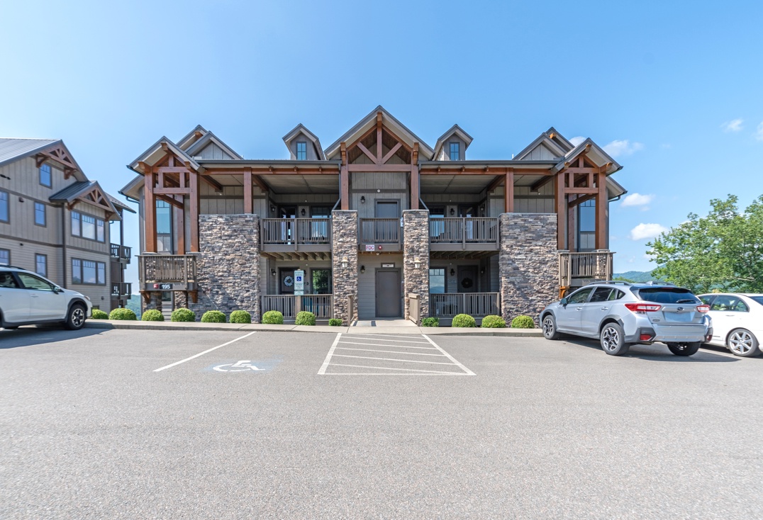 Description: Enjoy a beautiful view of mountain living from this rugged timber frame three- bedroom, three-bathroom bottom floor condo located in Chalakee, within Echota Resorts. This condo features a covered front entry and rear deck with an amazing mountain view. The view can be admired from the deck or from the large picture windows in the open kitchen and living room areas. The kitchen features custom kitchen cabinetry, granite countertops, hardwood floors, and stainless-steel appliances. It is fully equipped with everything to prepare a meal inside or outside on the built-in-gas grill. The living room is cozy and inviting with a cultured stone gas fireplace, hardwood floors, comfortable furniture and a TV. The primary bedroom is spacious and inviting with a mountain view and TV. The primary bath is set up for relaxation with his and her sinks and a gorgeous tile shower. The guest rooms are spacious and beautifully decorated each with bathrooms attached. The bathrooms are upgraded with ceramic tile flooring. Stay for a weekend to relax or an extended period and enjoy all the High Country has to offer. This condo is on the bottom floor (downstairs) with an elevator. In case of power outages or elevator equipment malfunctions, the condo will be stair access only.