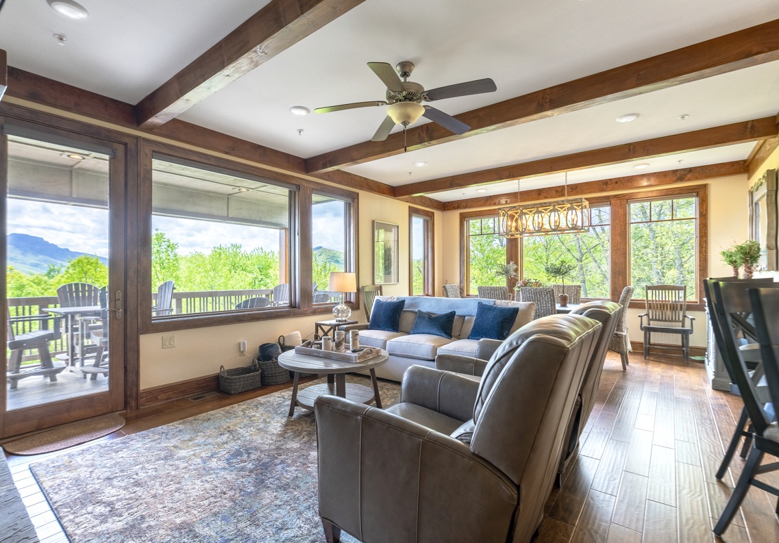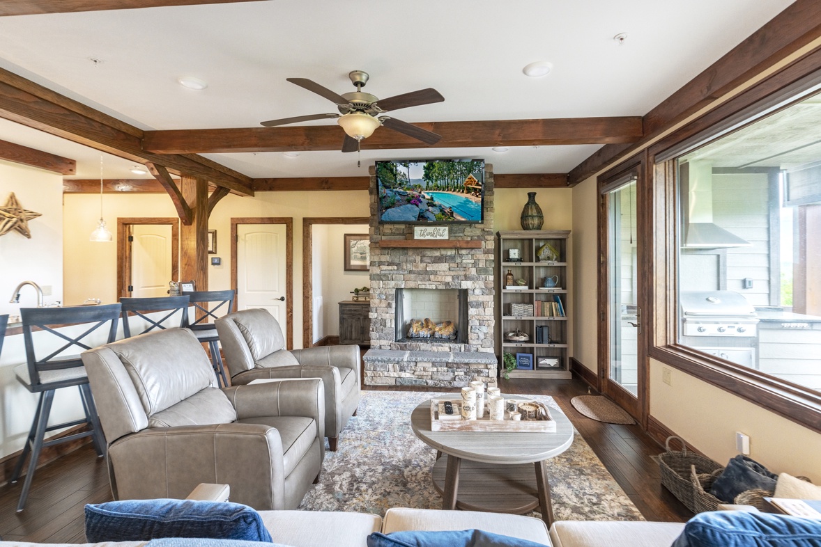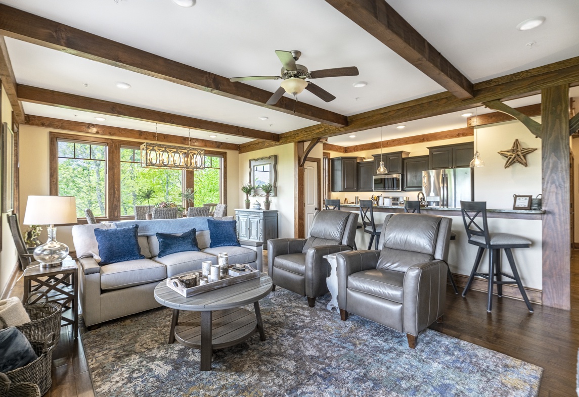 Description: Enjoy a beautiful view of mountain living from this rugged timber frame three- bedroom, three-bathroom bottom floor condo located in Chalakee, within Echota Resorts. This condo features a covered front entry and rear deck with an amazing mountain view. The view can be admired from the deck or from the large picture windows in the open kitchen and living room areas. The kitchen features custom kitchen cabinetry, granite countertops, hardwood floors, and stainless-steel appliances. It is fully equipped with everything to prepare a meal inside or outside on the built-in-gas grill. The living room is cozy and inviting with a cultured stone gas fireplace, hardwood floors, comfortable furniture and a TV. The primary bedroom is spacious and inviting with a mountain view and TV. The primary bath is set up for relaxation with his and her sinks and a gorgeous tile shower. The guest rooms are spacious and beautifully decorated each with bathrooms attached. The bathrooms are upgraded with ceramic tile flooring. Stay for a weekend to relax or an extended period and enjoy all the High Country has to offer. This condo is on the bottom floor (downstairs) with an elevator. In case of power outages or elevator equipment malfunctions, the condo will be stair access only.