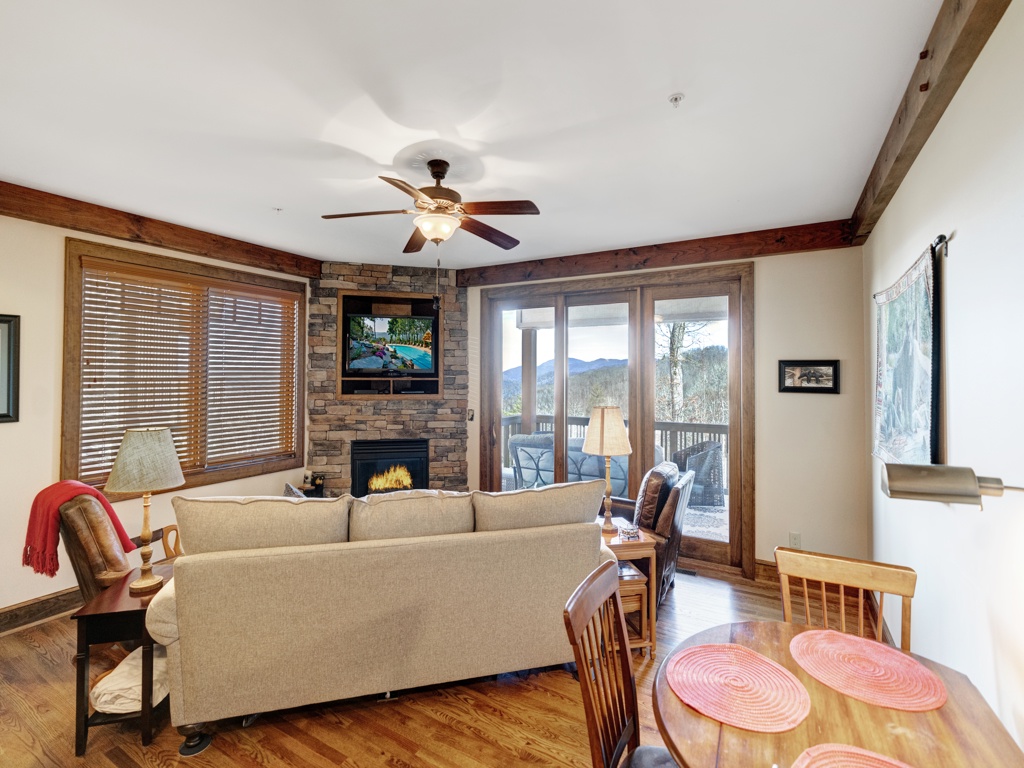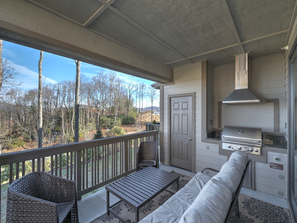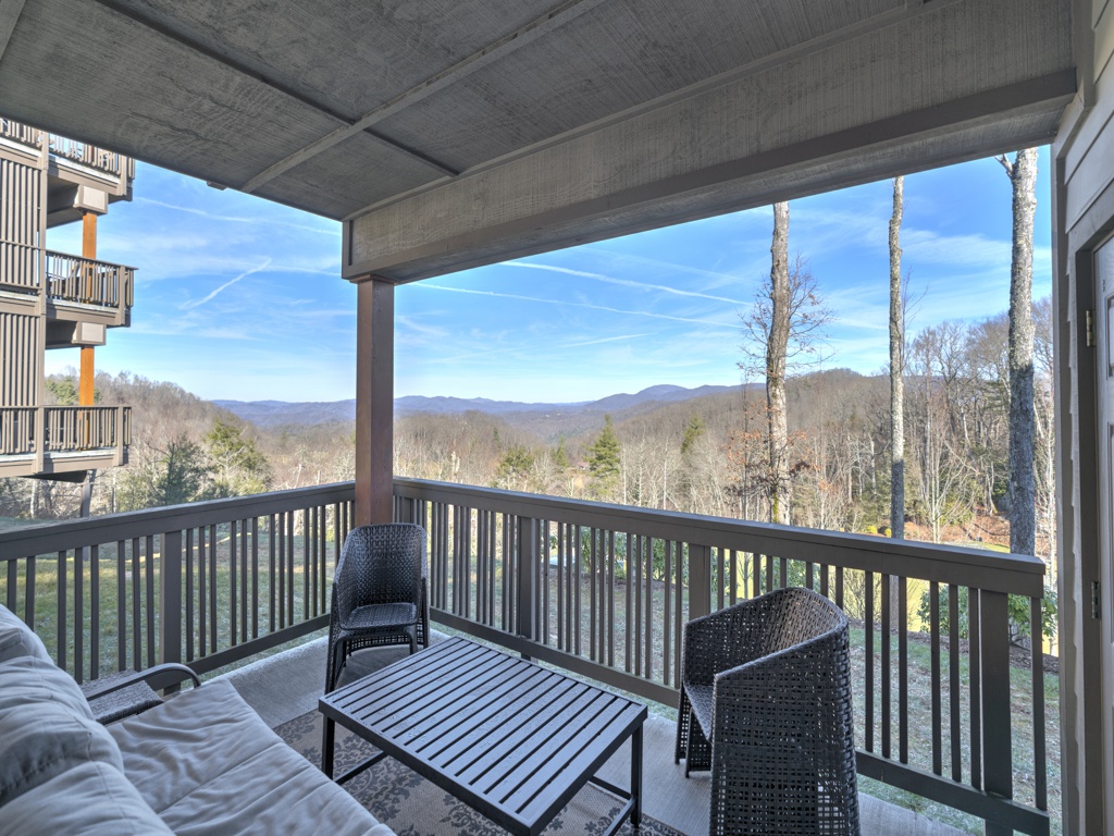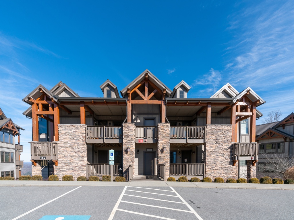Description: Enjoy a beautiful view of mountain living from this rugged timber frame one bedroom condo located in Chalakee, within Echota Resorts. This condo features a covered front entry and rear deck with an amazing Mountain view. The view can be admired from the deck or from the large picture windows in the open kitchen and living room areas. The kitchen features custom kitchen cabinetry, granite countertops, hardwood floors, and stainless-steel appliances. It is fully equipped with everything to prepare a meal inside or outside on the built-in-gas grill. The living room is cozy and inviting with a cultured stone gas fireplace, hardwood floors, comfortable furniture and a TV. Stay for a weekend to relax or an extended period and enjoy all the High Country has to offer. This condo is on the bottom floor (downstairs) with an elevator. In case of power outages or elevator equipment malfunctions, the condo will be stair access only.