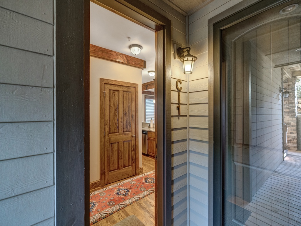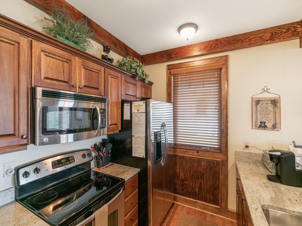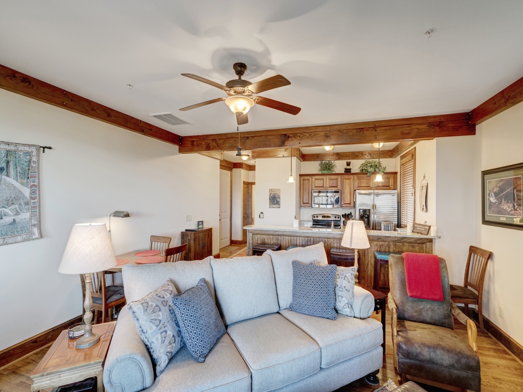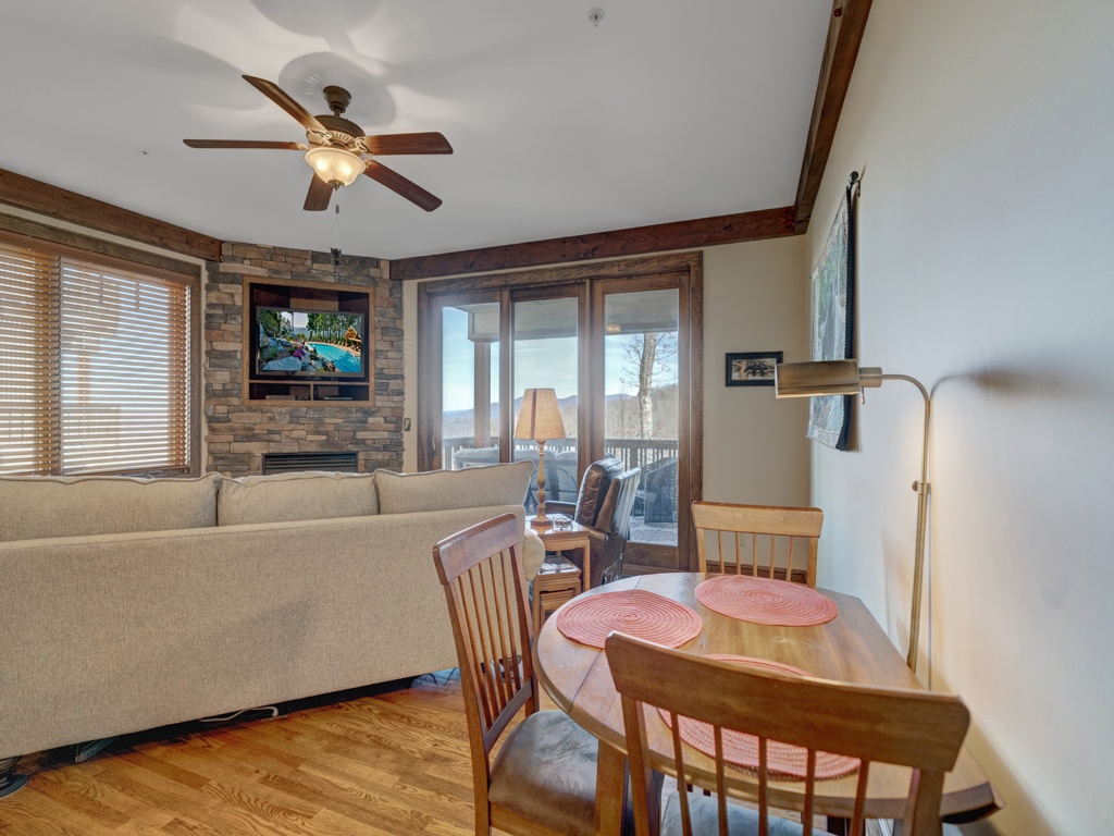 Description: Enjoy a beautiful view of mountain living from this rugged timber frame one bedroom condo located in Chalakee, within Echota Resorts. This condo features a covered front entry and rear deck with an amazing Mountain view. The view can be admired from the deck or from the large picture windows in the open kitchen and living room areas. The kitchen features custom kitchen cabinetry, granite countertops, hardwood floors, and stainless-steel appliances. It is fully equipped with everything to prepare a meal inside or outside on the built-in-gas grill. The living room is cozy and inviting with a cultured stone gas fireplace, hardwood floors, comfortable furniture and a TV. Stay for a weekend to relax or an extended period and enjoy all the High Country has to offer. This condo is on the bottom floor (downstairs) with an elevator. In case of power outages or elevator equipment malfunctions, the condo will be stair access only.