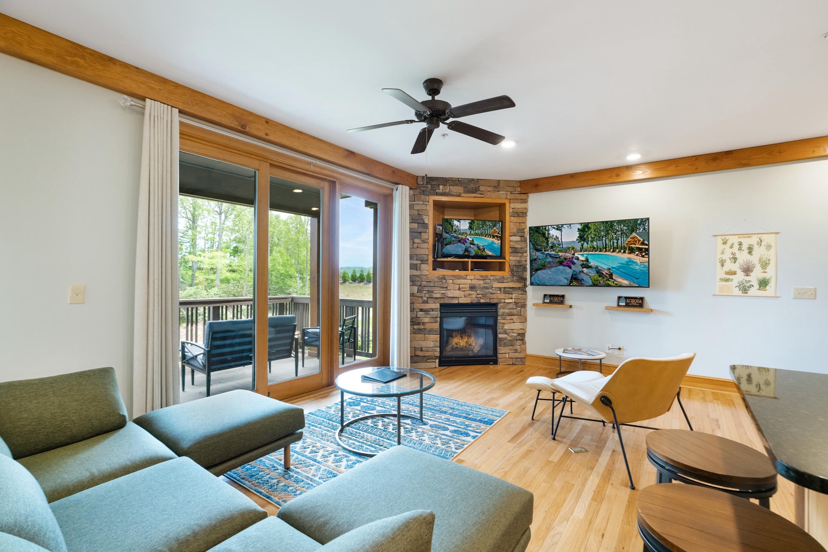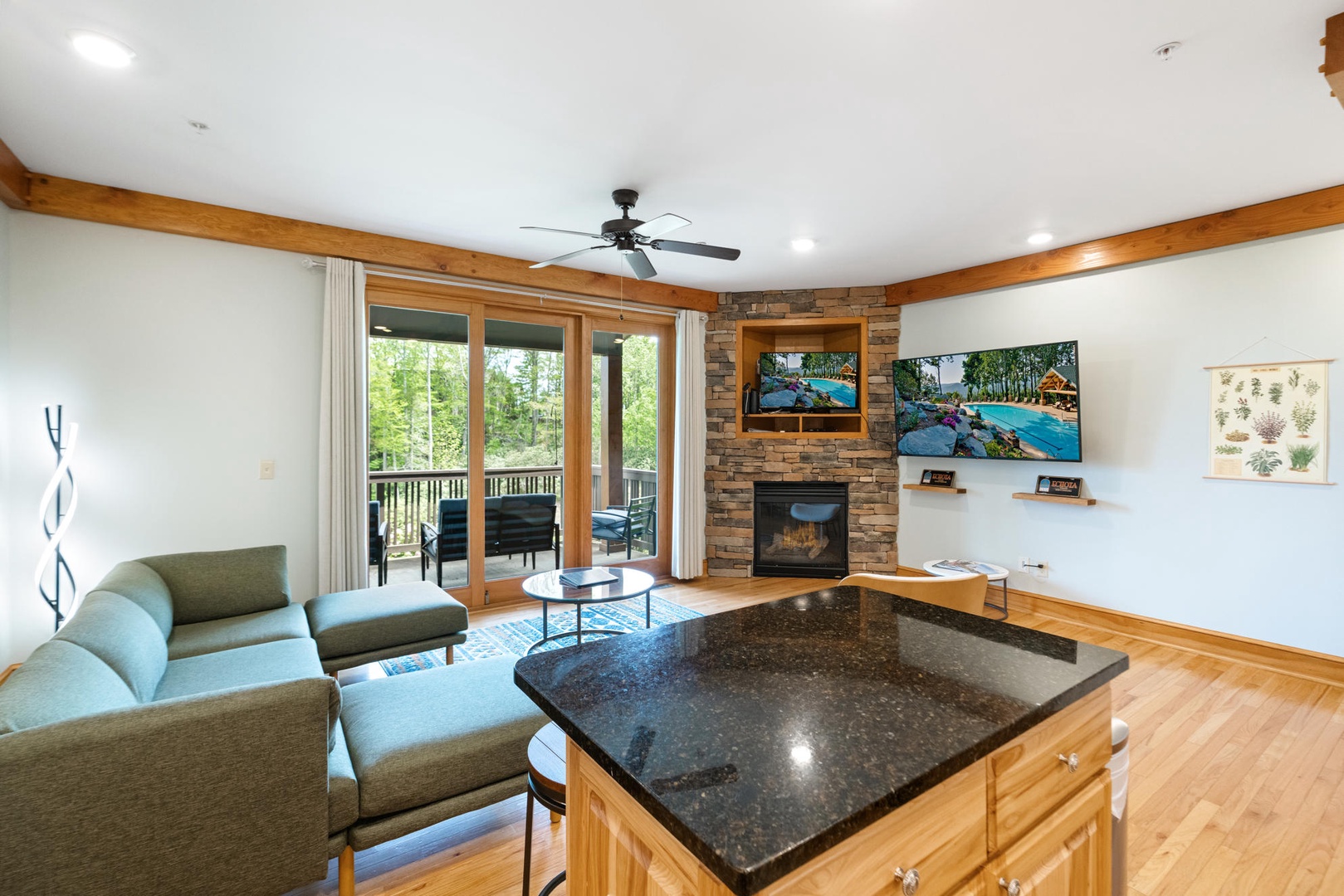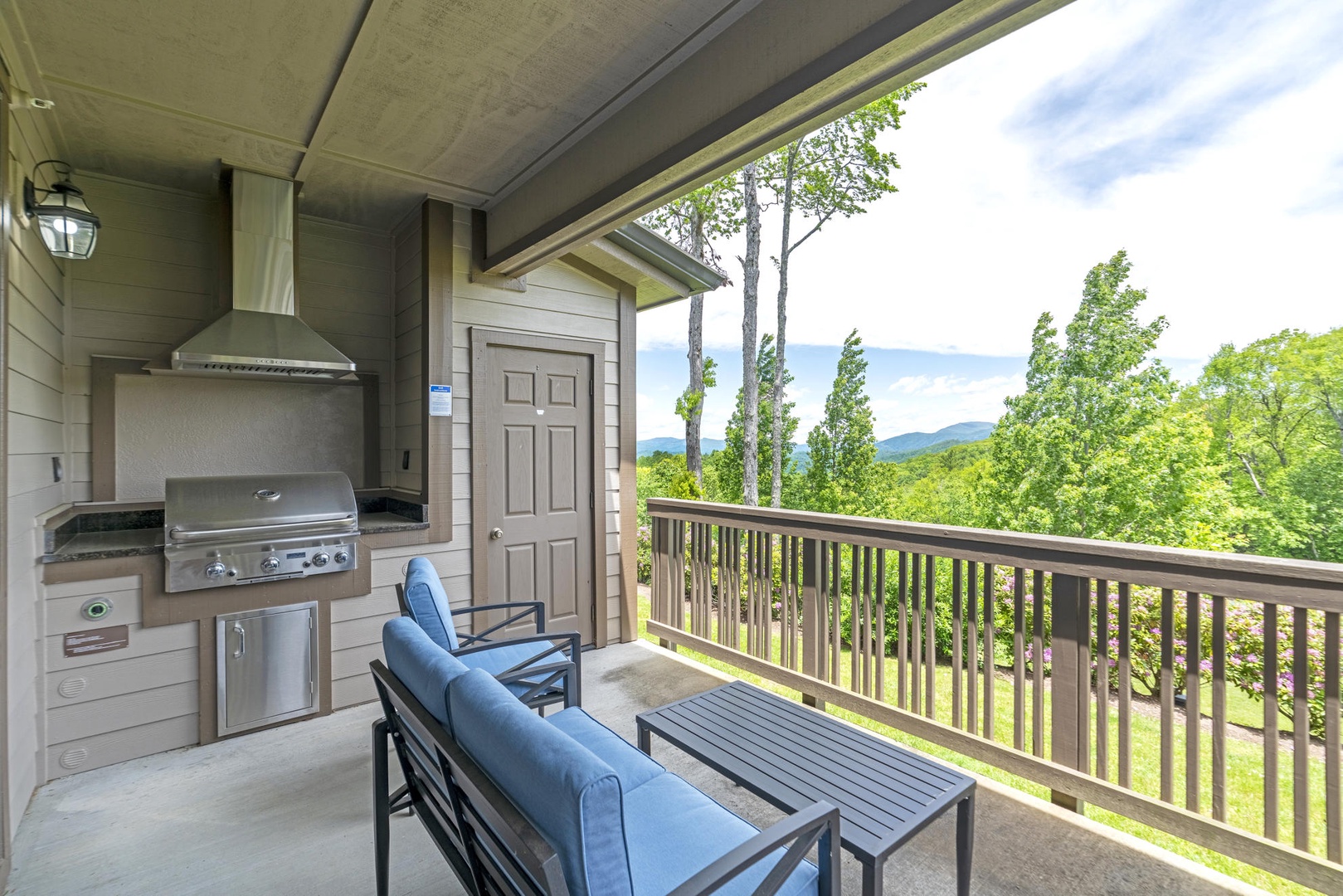 Description: Enjoy a beautiful view of mountain living from this rugged timber frame one bedroom condo located in Chalakee, within Echota Resorts. This condo features a covered front entry and rear deck with an amazing Grandfather Mountain view. The view can be admired from the deck or from the large picture windows in the open kitchen and living room areas. The kitchen features custom kitchen cabinetry, granite countertops, hardwood floors, and stainless-steel appliances. It is fully equipped with everything to prepare a meal inside or outside on the built-in-gas grill. The living room is cozy and inviting with a cultured stone gas fireplace, hardwood floors, comfortable furniture and a TV. Stay for a weekend to relax or an extended period and enjoy all the High Country has to offer. This condo is on the bottom floor (downstairs) with an elevator. In case of power outages or elevator equipment malfunctions, the condo will be stair access only.