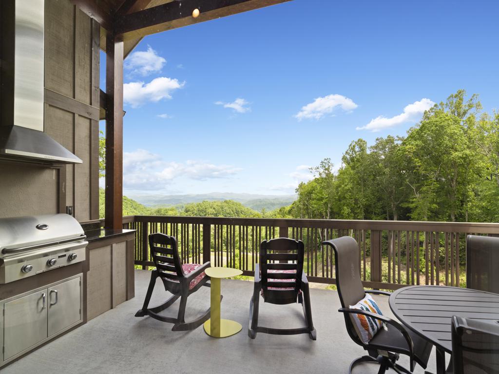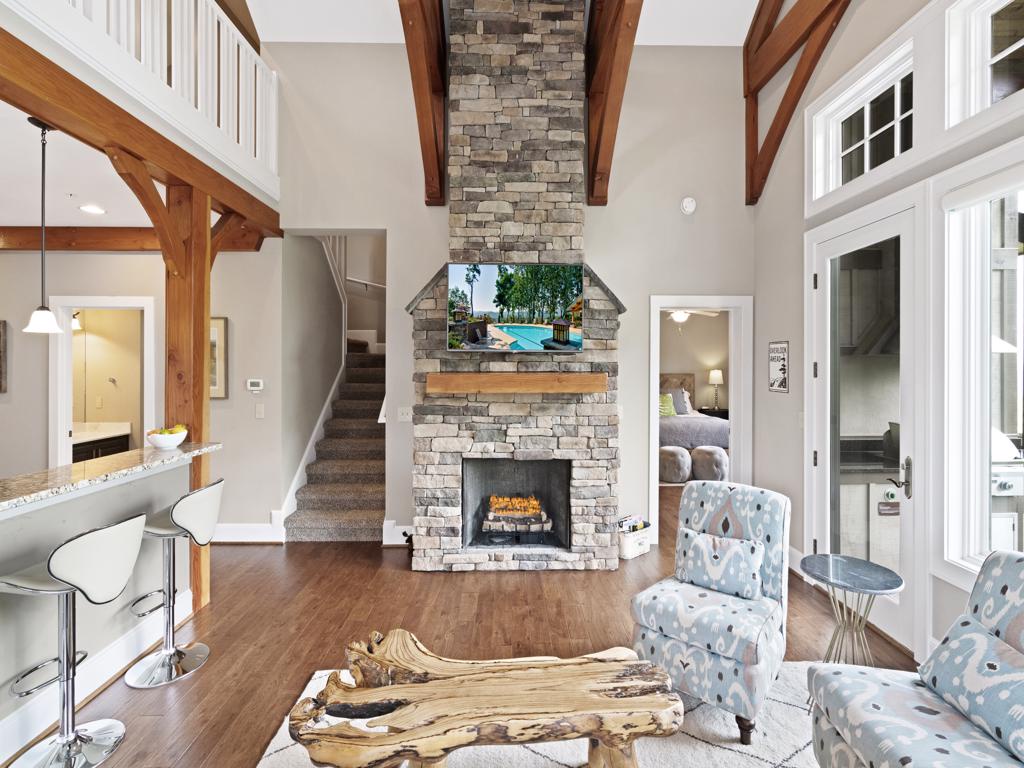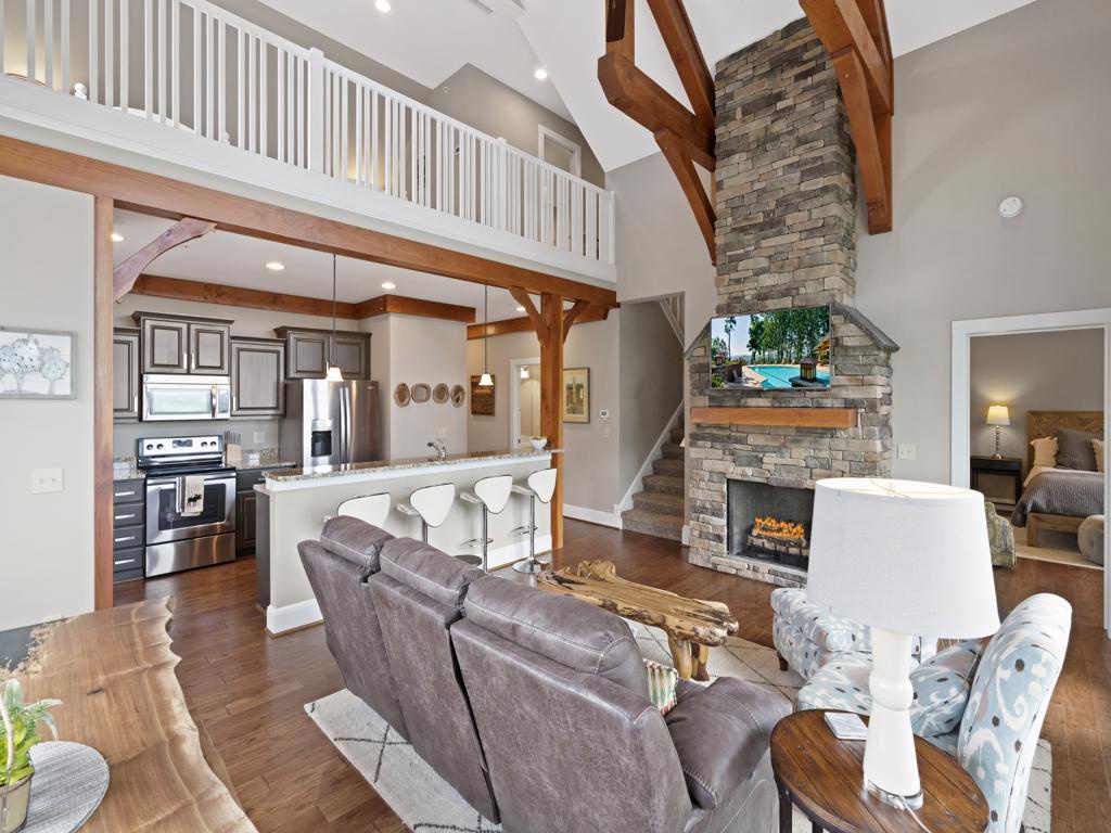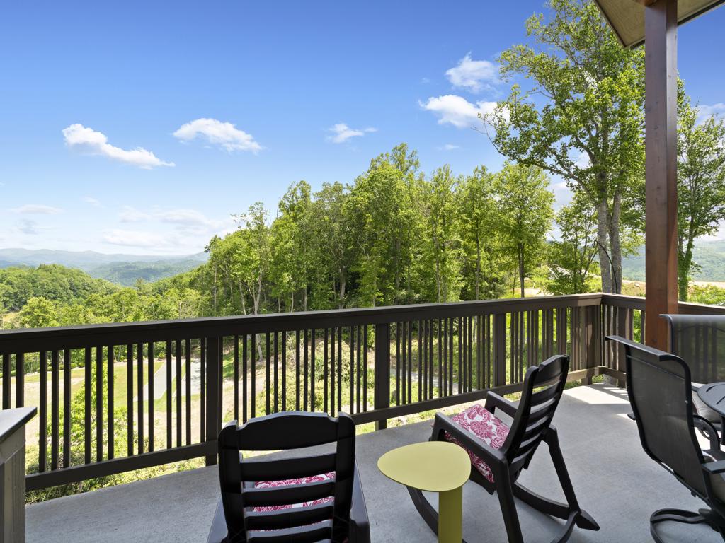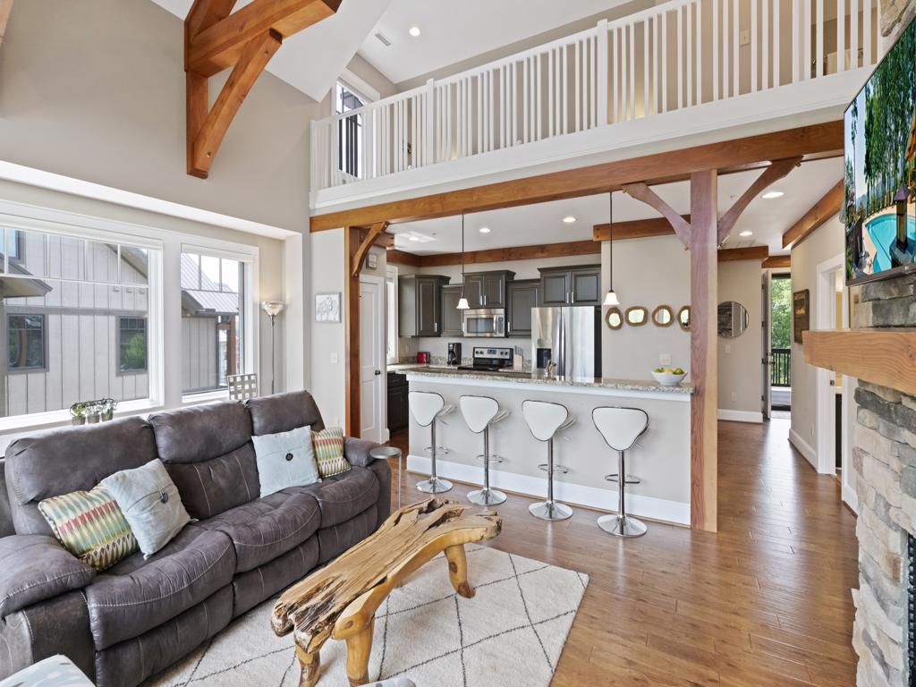 Description: Enjoy a beautiful view of mountain living from this rugged timber frame three- bedroom, four-bathroom top floor condo located in Chalakee, within Echota Resorts. This condo features a covered front entry and rear deck with an amazing mountain view. The view can be admired from the deck or from the large picture windows in the open kitchen and living room areas. The kitchen features custom kitchen cabinetry, granite countertops, hardwood floors, and stainless-steel appliances. It is fully equipped with everything to prepare a meal inside or outside on the built-in-gas grill. The living room is cozy and inviting with a cultured stone gas fireplace, hardwood floors, comfortable furniture and a TV. The primary bedroom is spacious and inviting with a mountain view and TV. The primary bath is set up for relaxation with his and her sinks and a gorgeous tile shower. The guest rooms are spacious and beautifully decorated, each with bathrooms attached. The open upstairs loft area has two twin beds and another bathroom. The spacious upstairs closet includes a table and stools for use as a game nook or office space. The bathrooms are upgraded with ceramic tile flooring. Stay for a weekend to relax or an extended period and enjoy all the High Country has to offer. This condo is on the top floor (upstairs) with an elevator. In case of power outages or elevator equipment malfunctions, the condo will be stair access only.