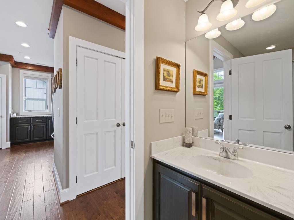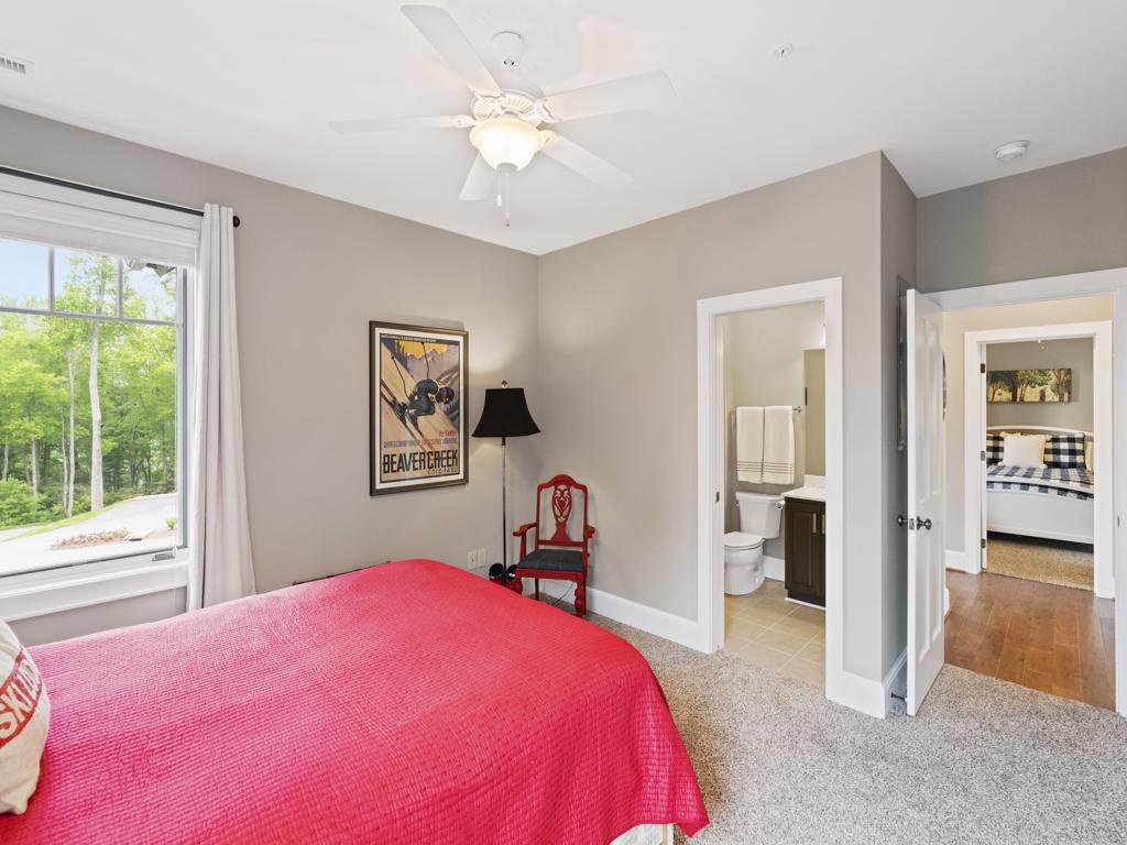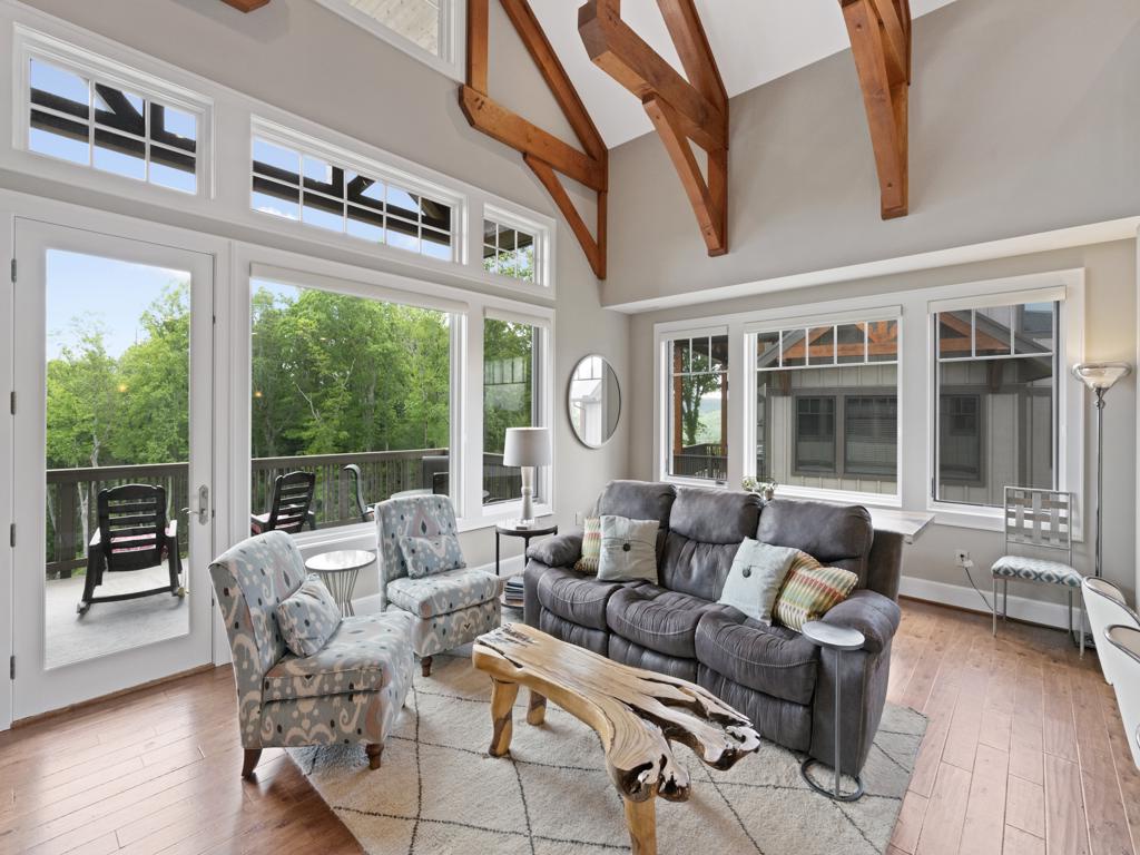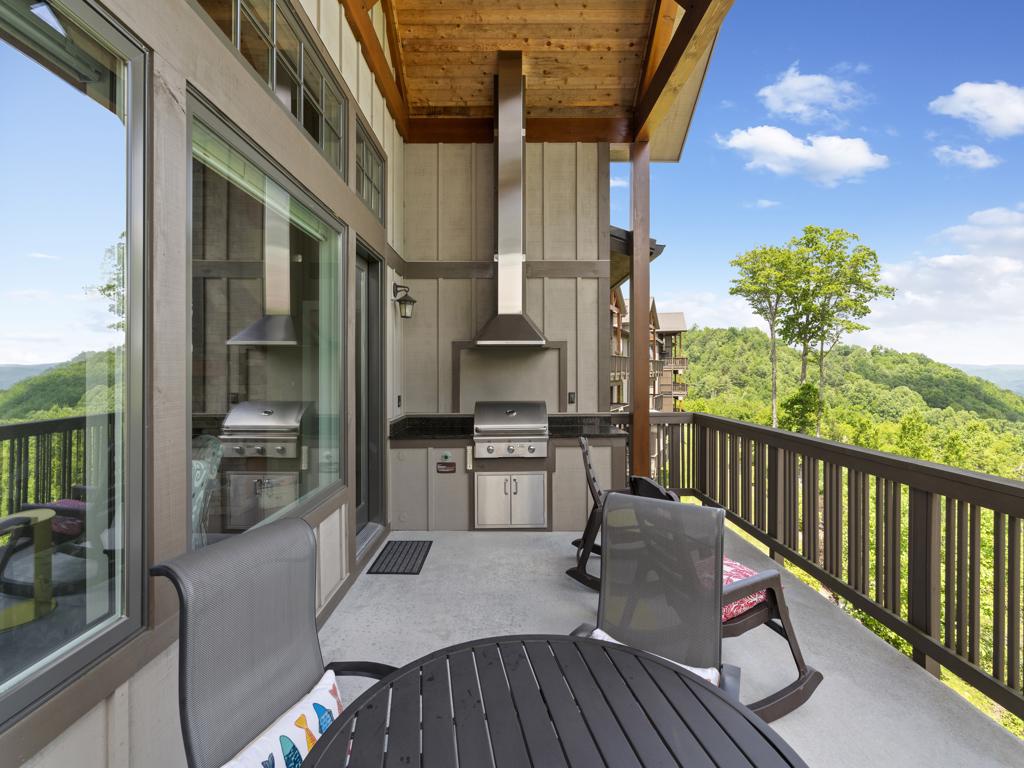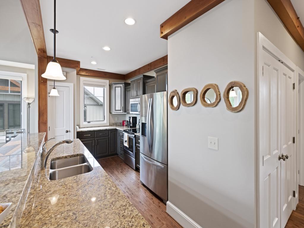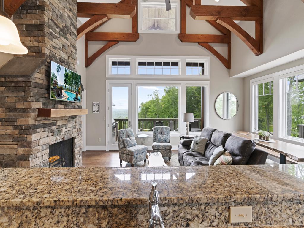 Description: Enjoy a beautiful view of mountain living from this rugged timber frame three- bedroom, four-bathroom top floor condo located in Chalakee, within Echota Resorts. This condo features a covered front entry and rear deck with an amazing mountain view. The view can be admired from the deck or from the large picture windows in the open kitchen and living room areas. The kitchen features custom kitchen cabinetry, granite countertops, hardwood floors, and stainless-steel appliances. It is fully equipped with everything to prepare a meal inside or outside on the built-in-gas grill. The living room is cozy and inviting with a cultured stone gas fireplace, hardwood floors, comfortable furniture and a TV. The primary bedroom is spacious and inviting with a mountain view and TV. The primary bath is set up for relaxation with his and her sinks and a gorgeous tile shower. The guest rooms are spacious and beautifully decorated, each with bathrooms attached. The open upstairs loft area has two twin beds and another bathroom. The spacious upstairs closet includes a table and stools for use as a game nook or office space. The bathrooms are upgraded with ceramic tile flooring. Stay for a weekend to relax or an extended period and enjoy all the High Country has to offer. This condo is on the top floor (upstairs) with an elevator. In case of power outages or elevator equipment malfunctions, the condo will be stair access only.
