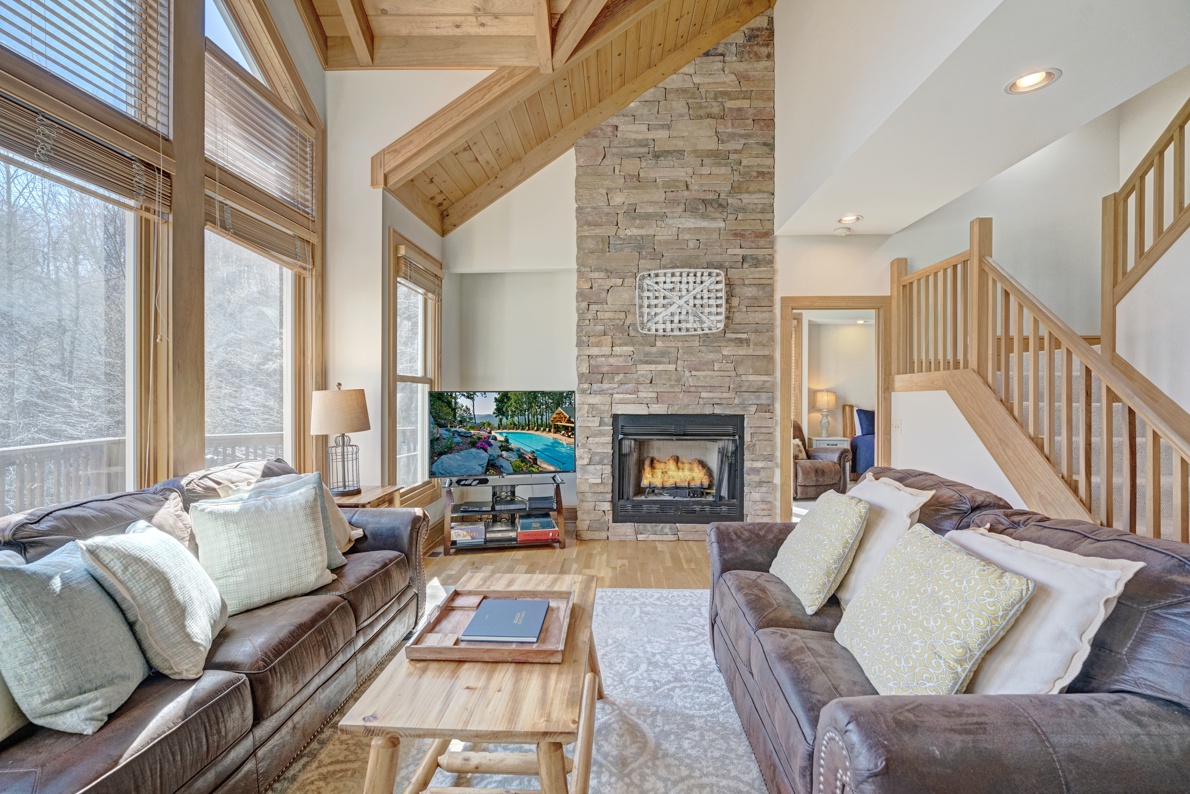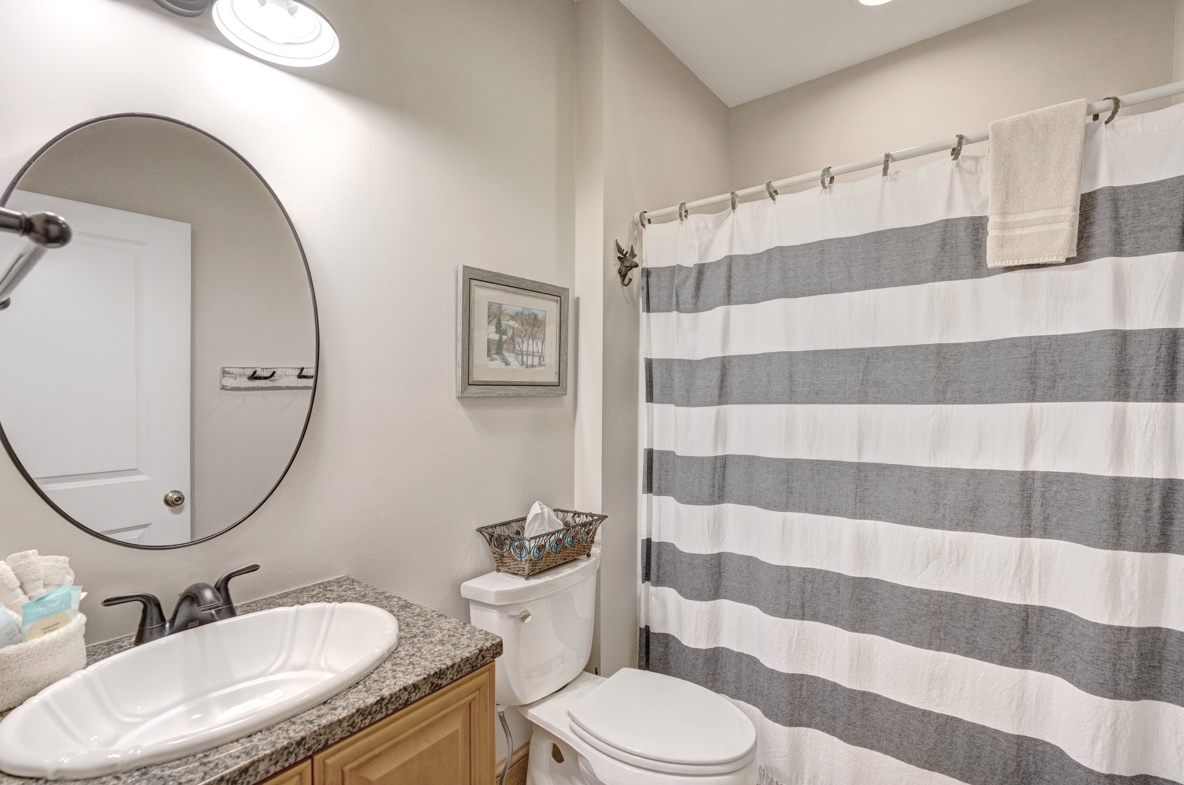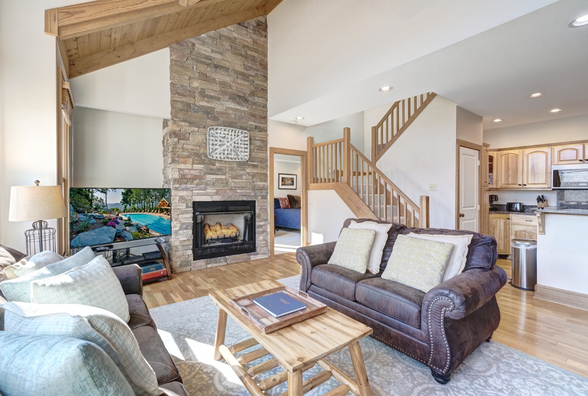 The main level welcomes you with a well-appointed kitchen, inviting living and dining areas, a primary suite with bathroom, guest bedroom and bathroom, and a generously sized deck. The upscale kitchen boasts stainless appliances, granite countertops, and seating for four at the kitchen bar area. Guests can relax in the living room, offering ample seating to enjoy the cozy gas logs, watch television, or indulge in a good book. The primary suite features a king-size bed, standalone shower, double vanity, large closet, and access to the main floor deck. The adjacent guest bedroom on the main floor features a queen-size bed and an adjoining full bathroom.