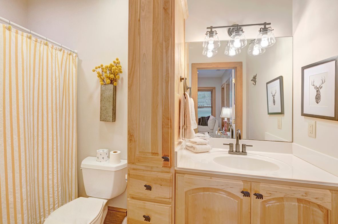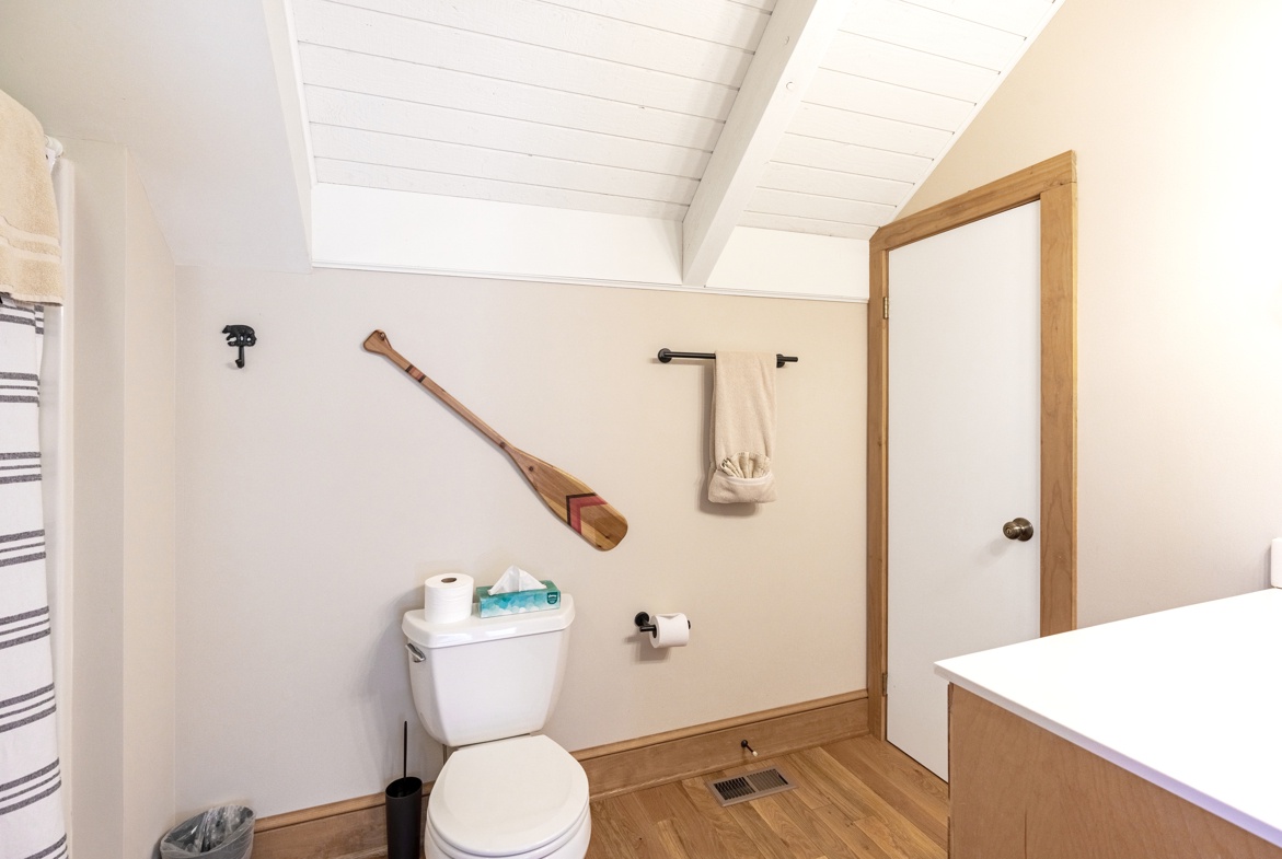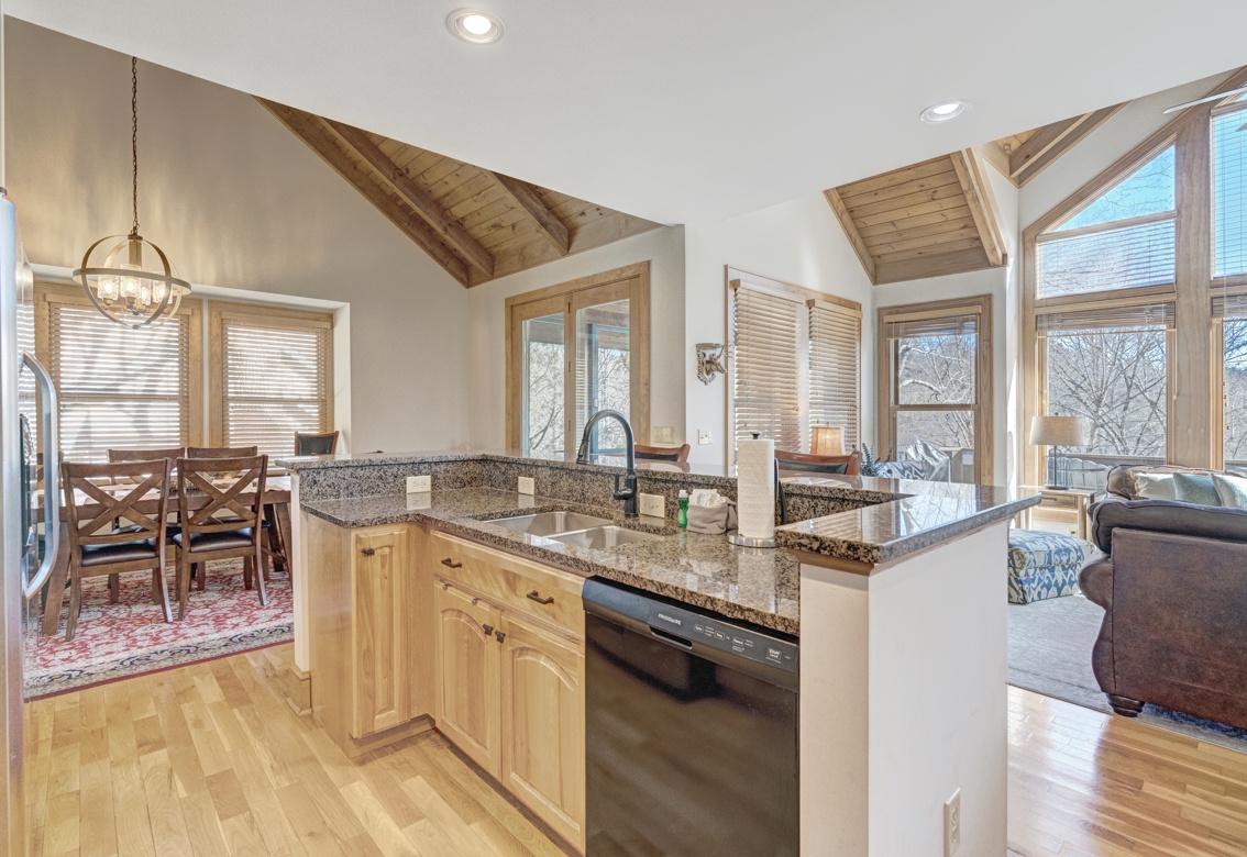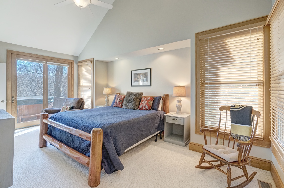 The main level welcomes you with a well-appointed kitchen, inviting living and dining areas, a primary suite with bathroom, guest bedroom and bathroom, and a generously sized deck. The upscale kitchen boasts stainless appliances, granite countertops, and seating for four at the kitchen bar area. Guests can relax in the living room, offering ample seating to enjoy the cozy gas logs, watch television, or indulge in a good book. The primary suite features a king-size bed, standalone shower, double vanity, large closet, and access to the main floor deck. The adjacent guest bedroom on the main floor features a queen-size bed and an adjoining full bathroom.