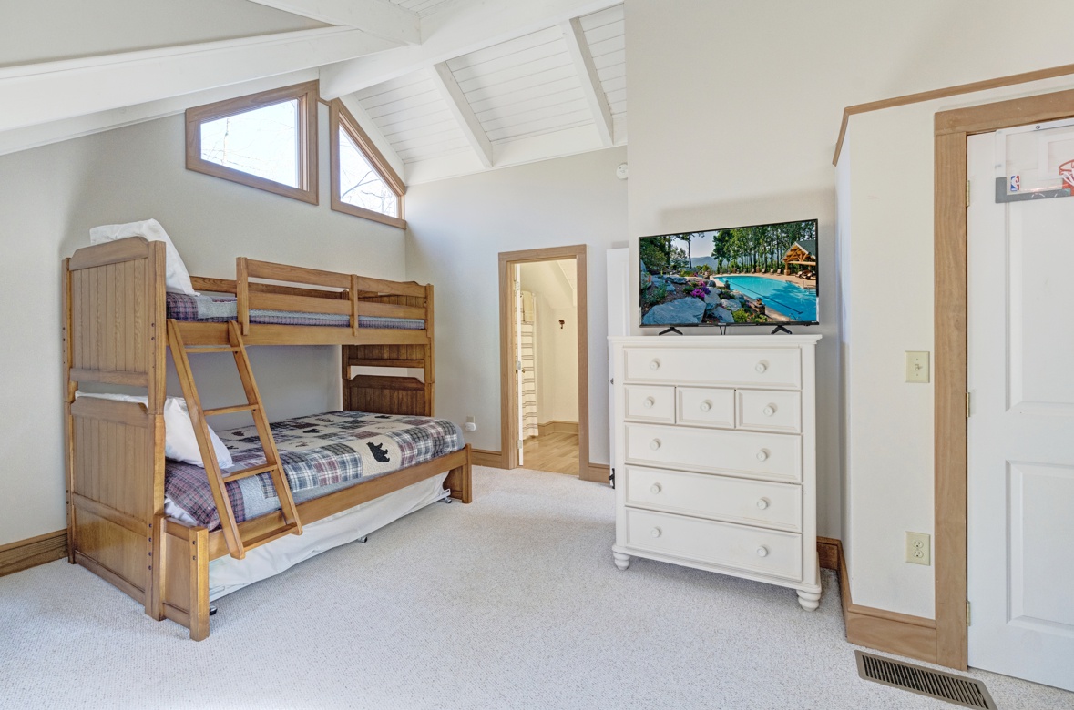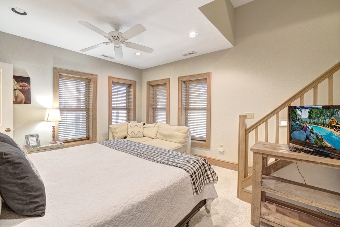 Ascend to the upper level, where a spacious bedroom awaits with a twin/full bunk bed, television, and an air hockey table for guests of all ages to enjoy. A full bathroom adjoins this room, ensuring convenience and comfort. The lower level introduces an additional master suite with a king-size bed, sofa, television, and a full bath.