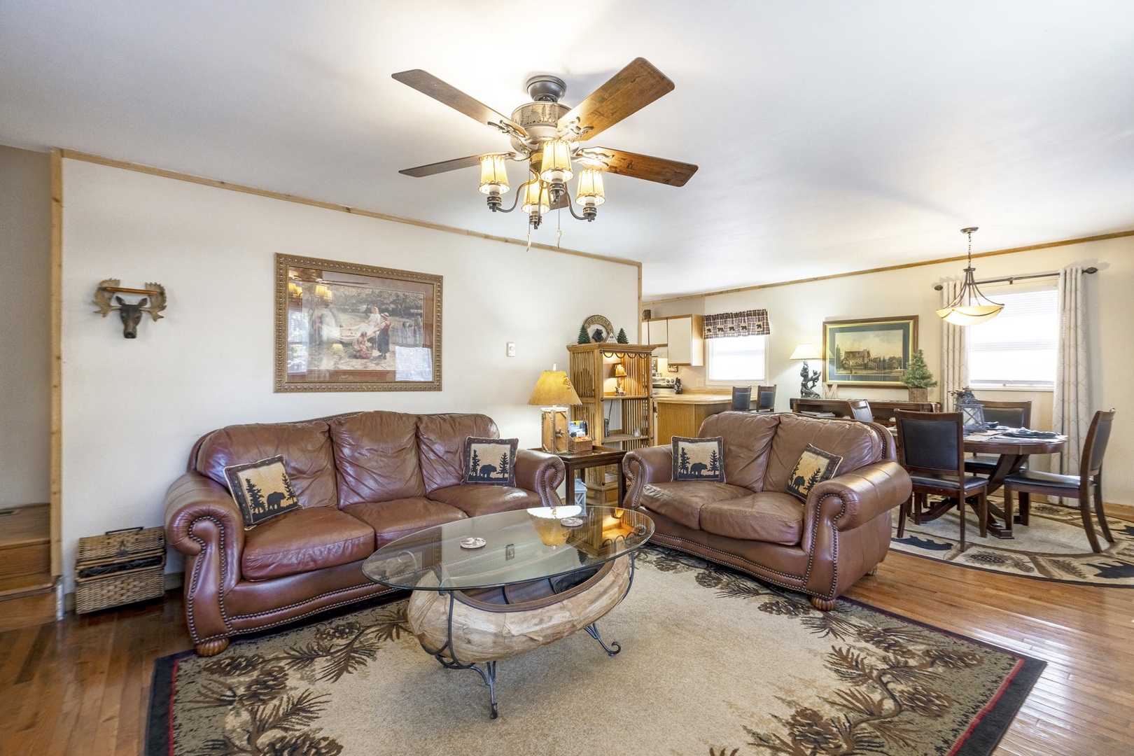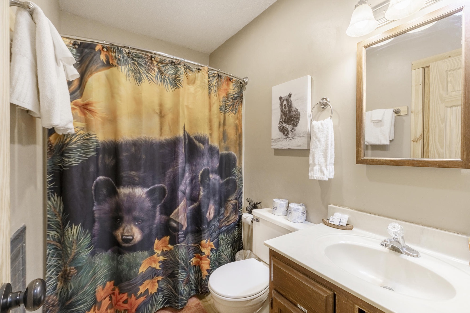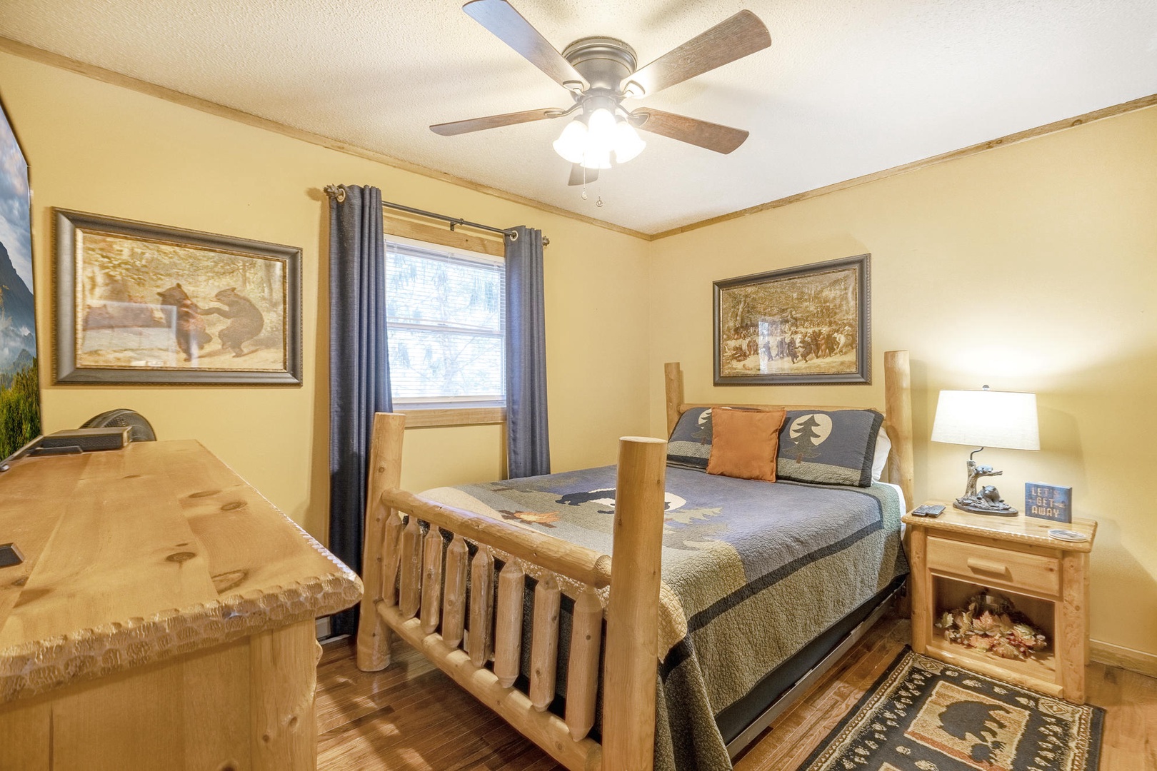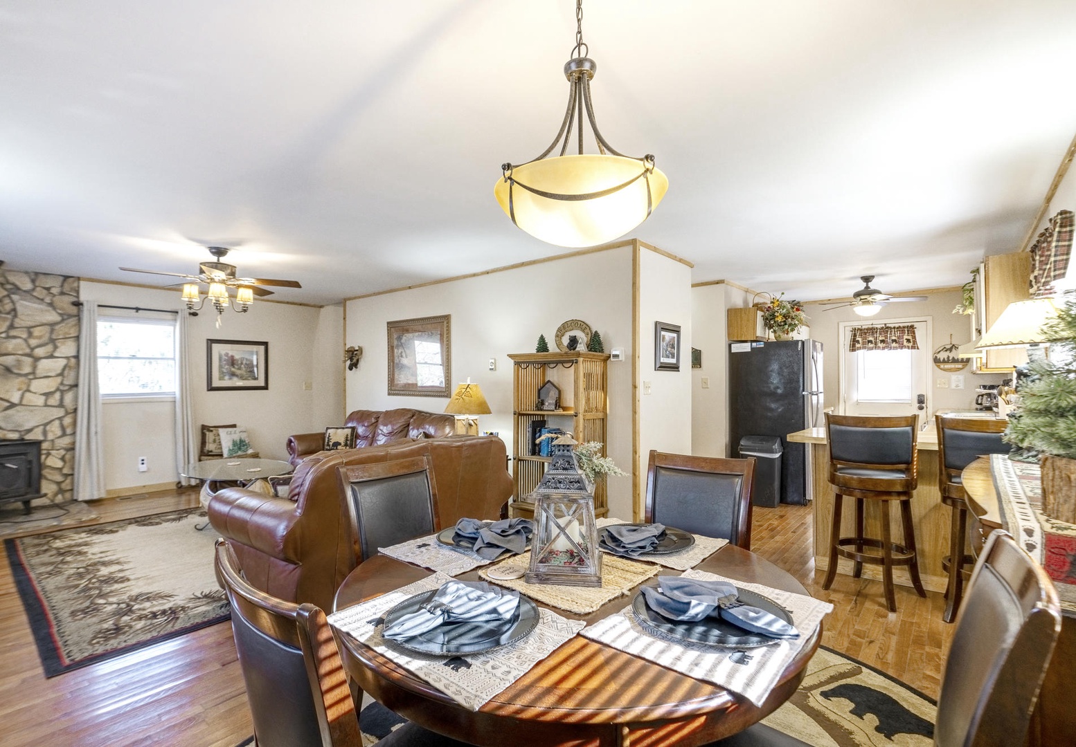 Inside, the cabin features oak hardwood floors and rustic touches, creating a comfortable and inviting atmosphere. The living room, with its large flat-screen TV, is visible from both the dining area and the kitchen. The first bedroom, located off the kitchen, has a queen-size log bed and another flat-screen TV. The second queen bedroom is upstairs, and the third bedroom, ideal for children, has two twin beds and its own TV. Two full bathrooms with shower/tub combos are available, one on each floor.