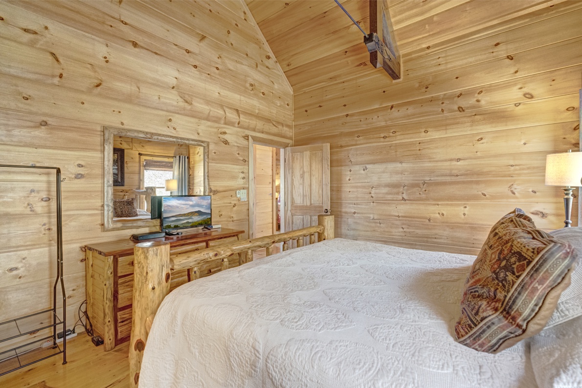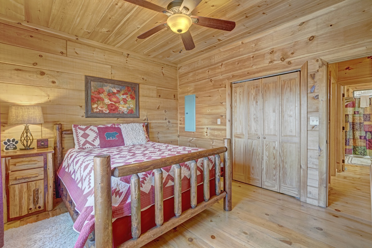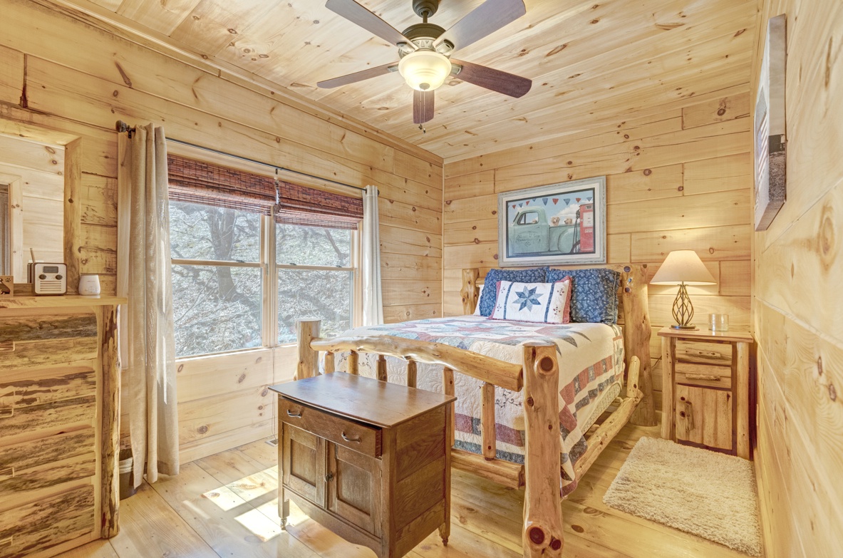 Queen bed in room behind fireplace - bed frame may need to be replaced. Side rails come apart from headboard easily.