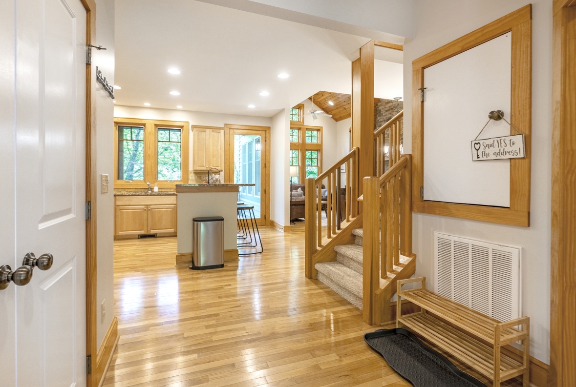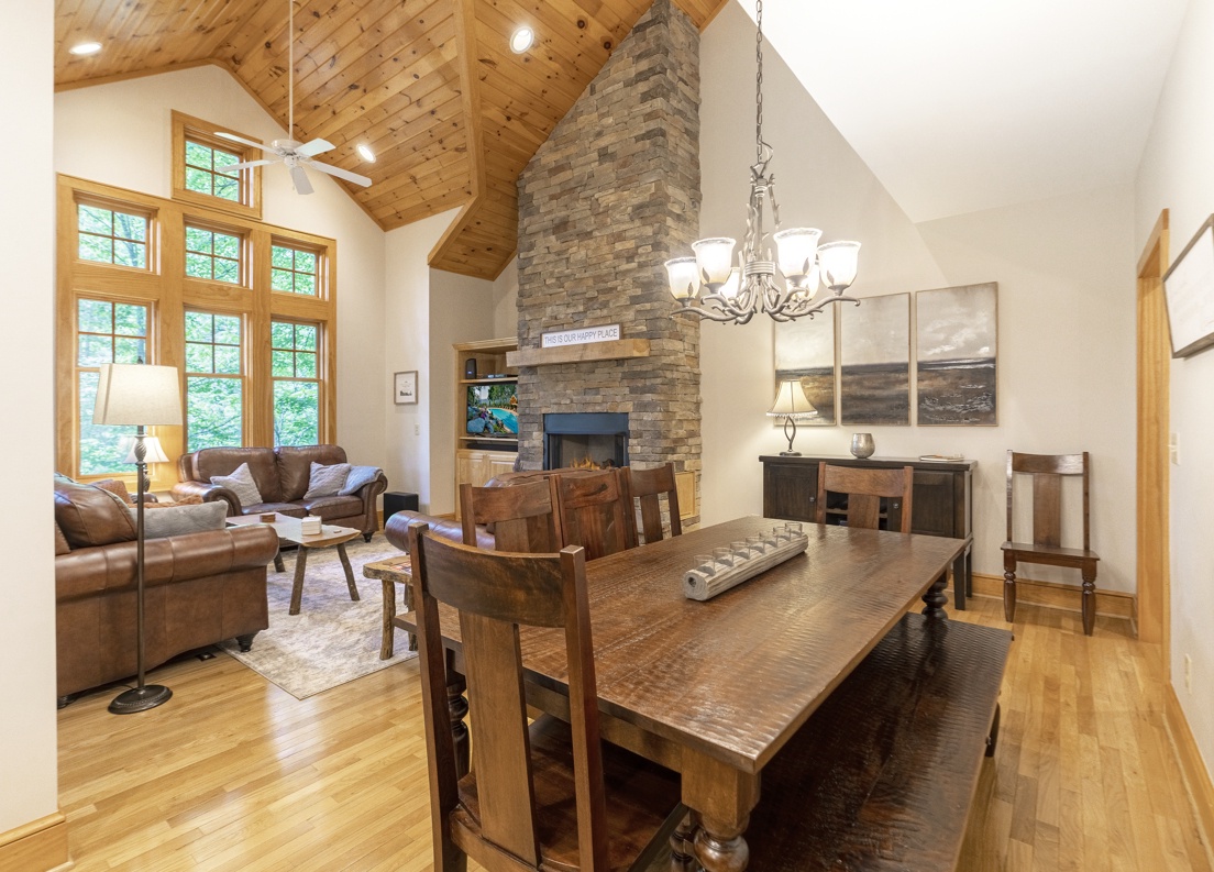 The main floor invites you into a sanctuary of comfort and style, featuring a luxurious primary bedroom with an en-suite bathroom. The gourmet kitchen is adorned with granite countertops and stainless-steel appliances, perfect to stay in and prepare a meal to enjoy. An open floor plan seamlessly connects the large dining area and a cozy living room highlighted by cathedral ceilings, leather furnishings, and a striking floor-to-ceiling stone fireplace. Step outside onto the deck to enjoy outdoor dining and grilling with a backdrop of tranquil wooded views, creating an ideal setting for relaxation.