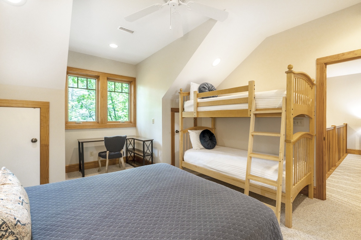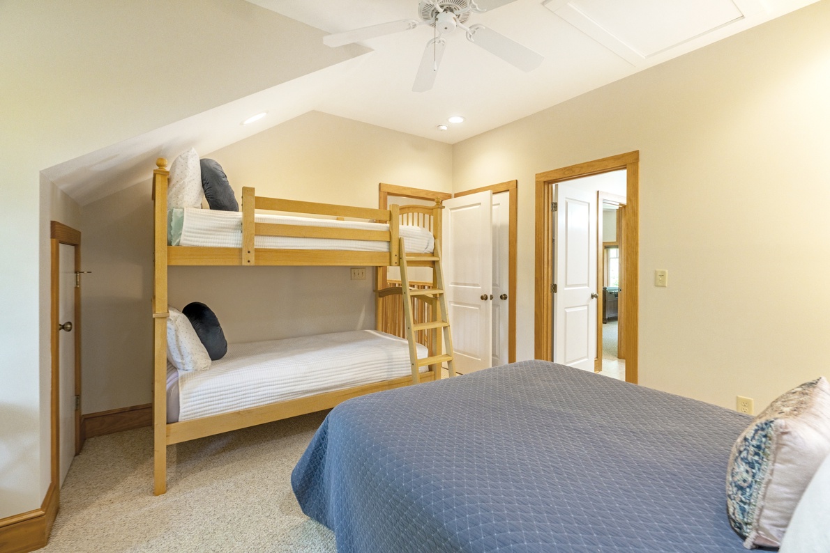 Bed Configuration: King (Primary Bedroom, Main Floor), Two Queens (Guest Bedroom, Upstairs), Queen and Twin Bunk Beds (Guest Bedroom, Upstairs), King (Guest Bedroom, Downstairs)
