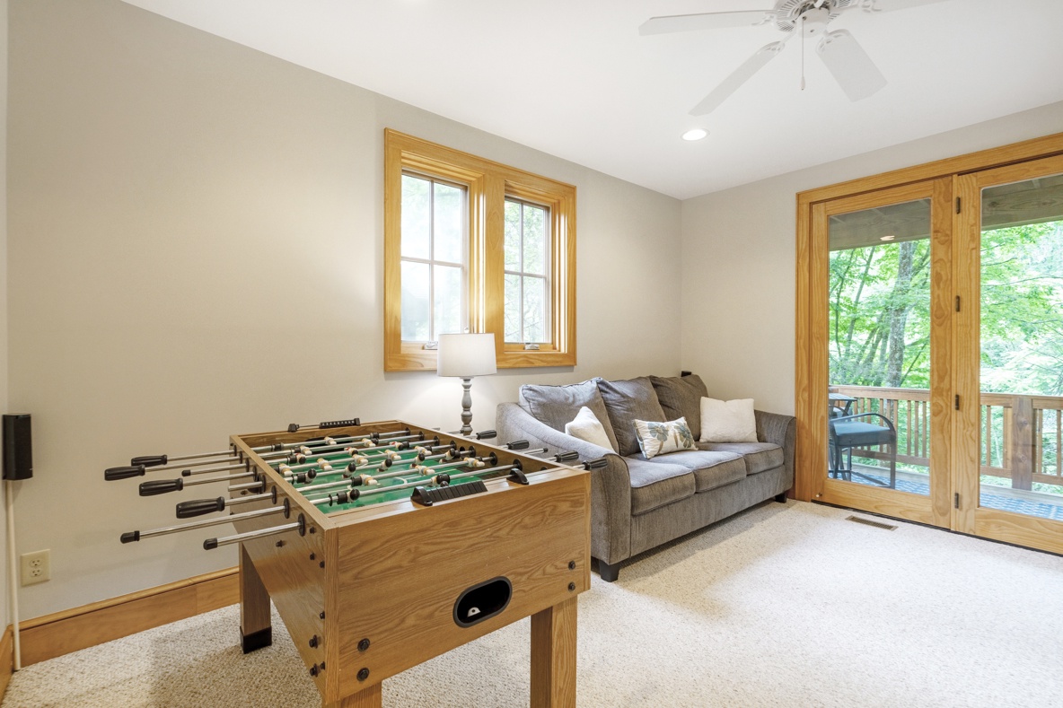 Descend to the lower level where a second living area awaits (recreation room), complete with a foosball table for lively entertainment. This level also includes another bedroom suite with its own bathroom and access to a private deck, offering a retreat within a retreat.