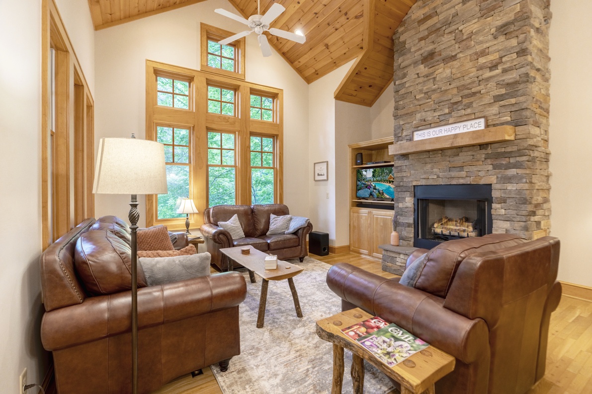 Living Room--- Cathedral Ceiling, Stone Fireplace