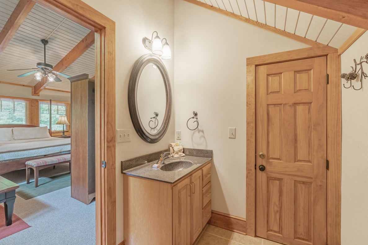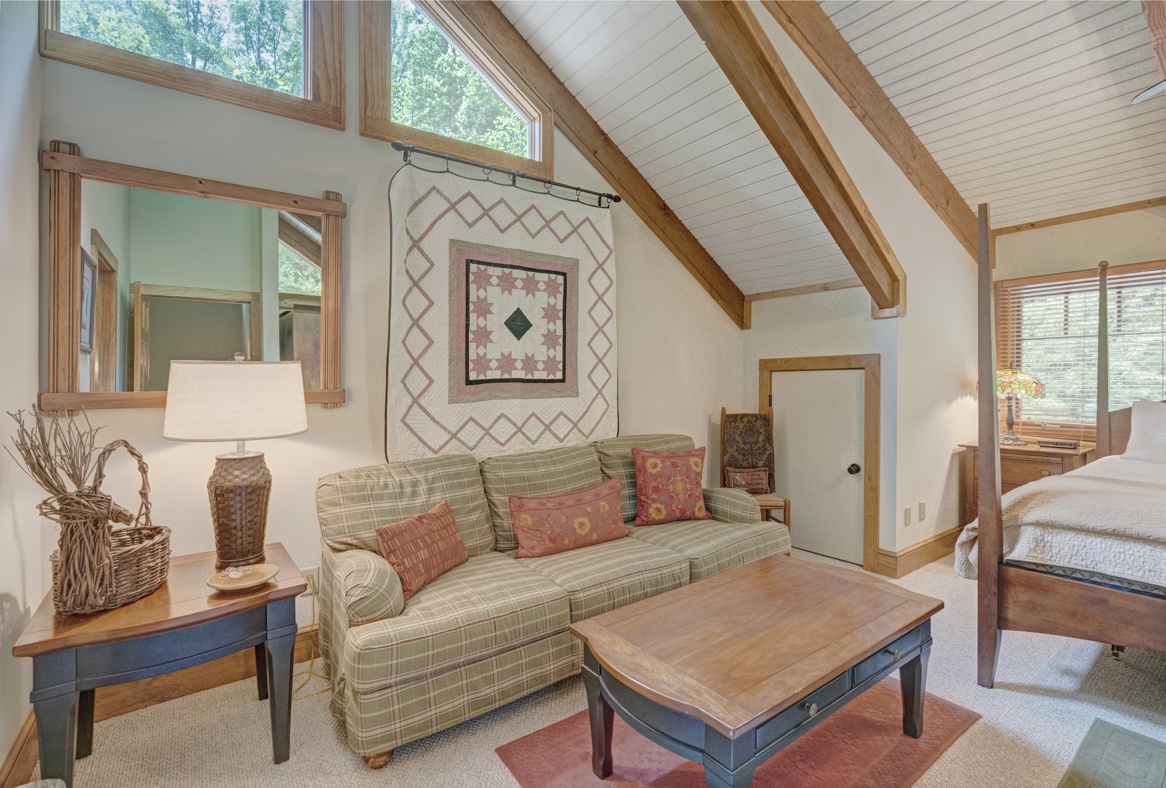 Ascending to the loft area reveals an inviting space with a king-sized bed and a sofa, creating a cozy spot for relaxation. Downstairs, another room beckons with a television and a sleeper sofa for additional comfort.