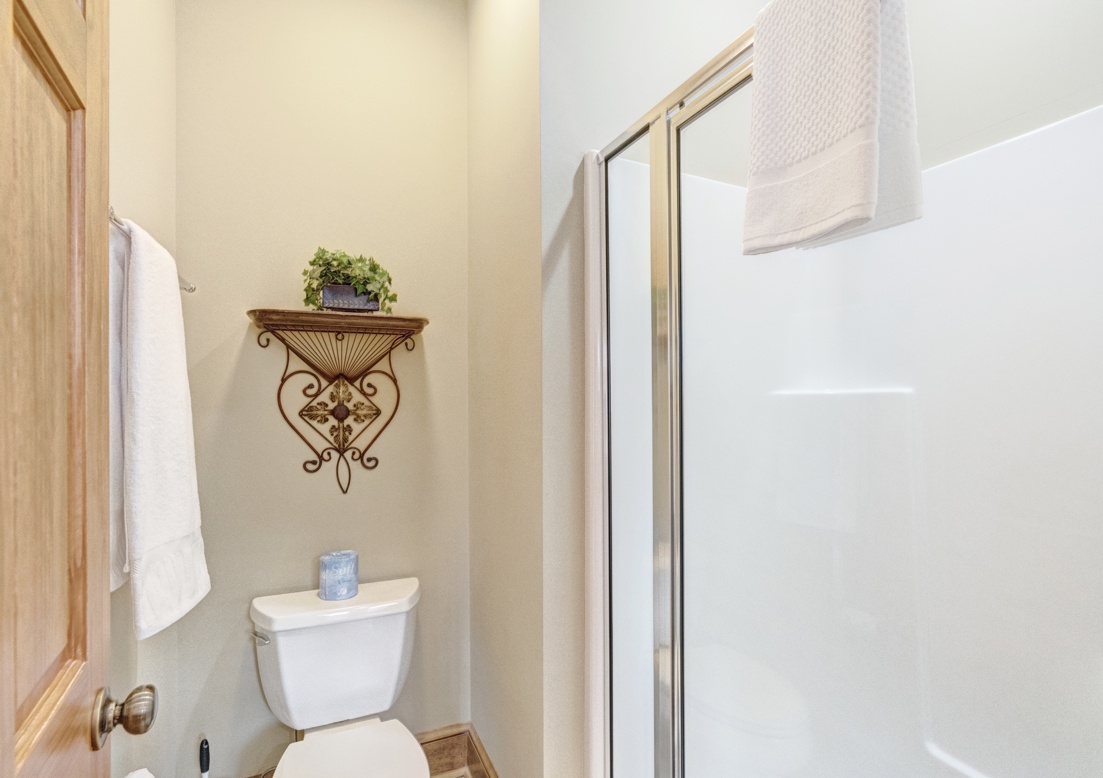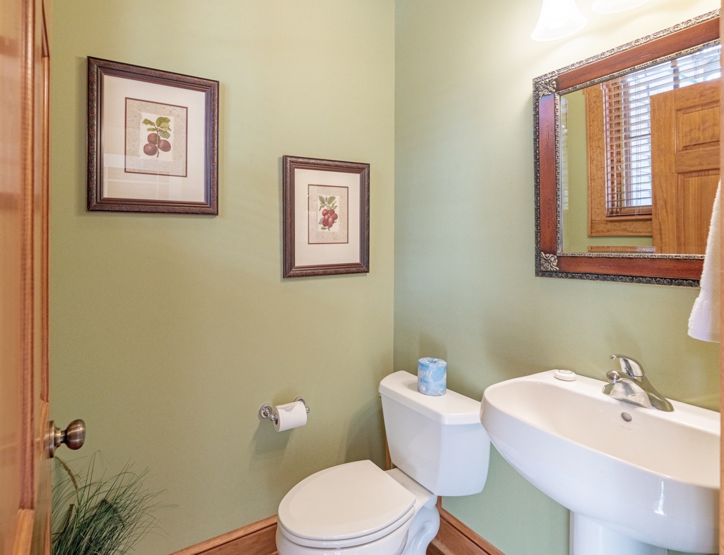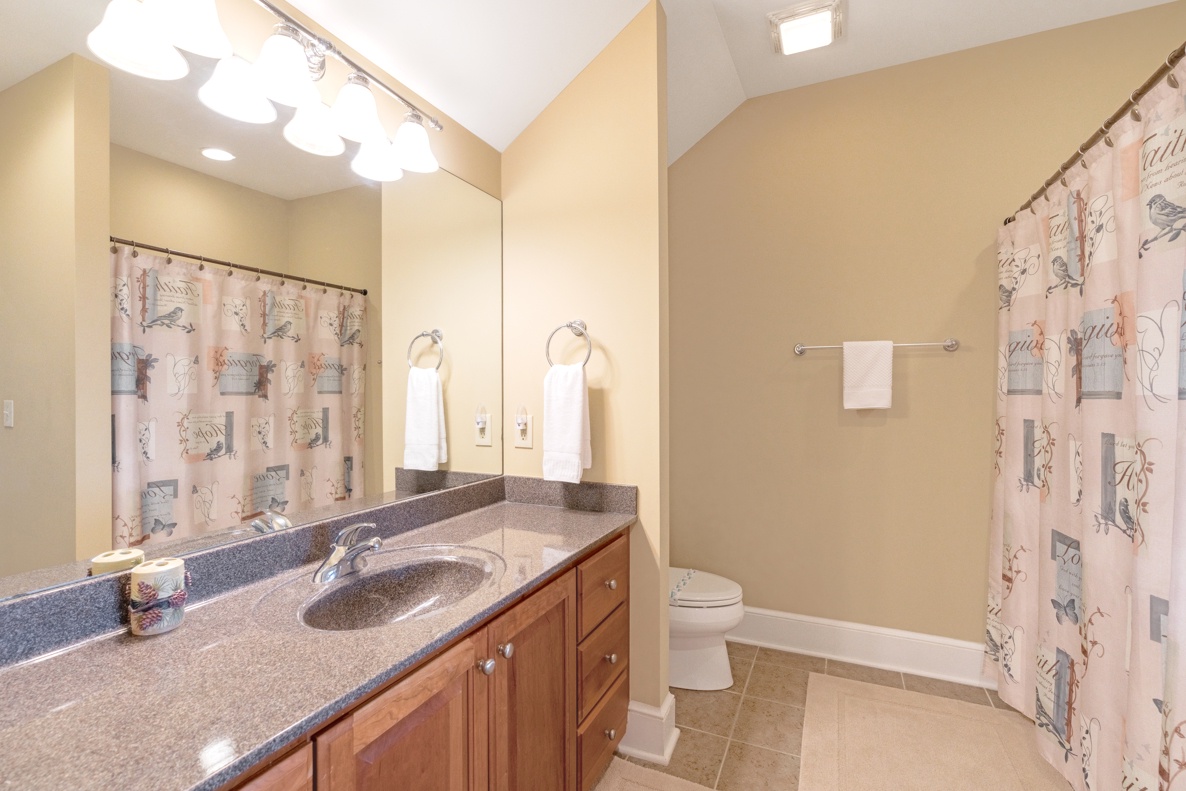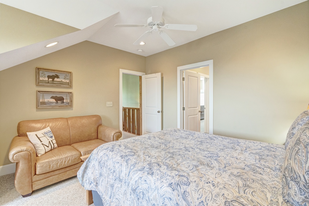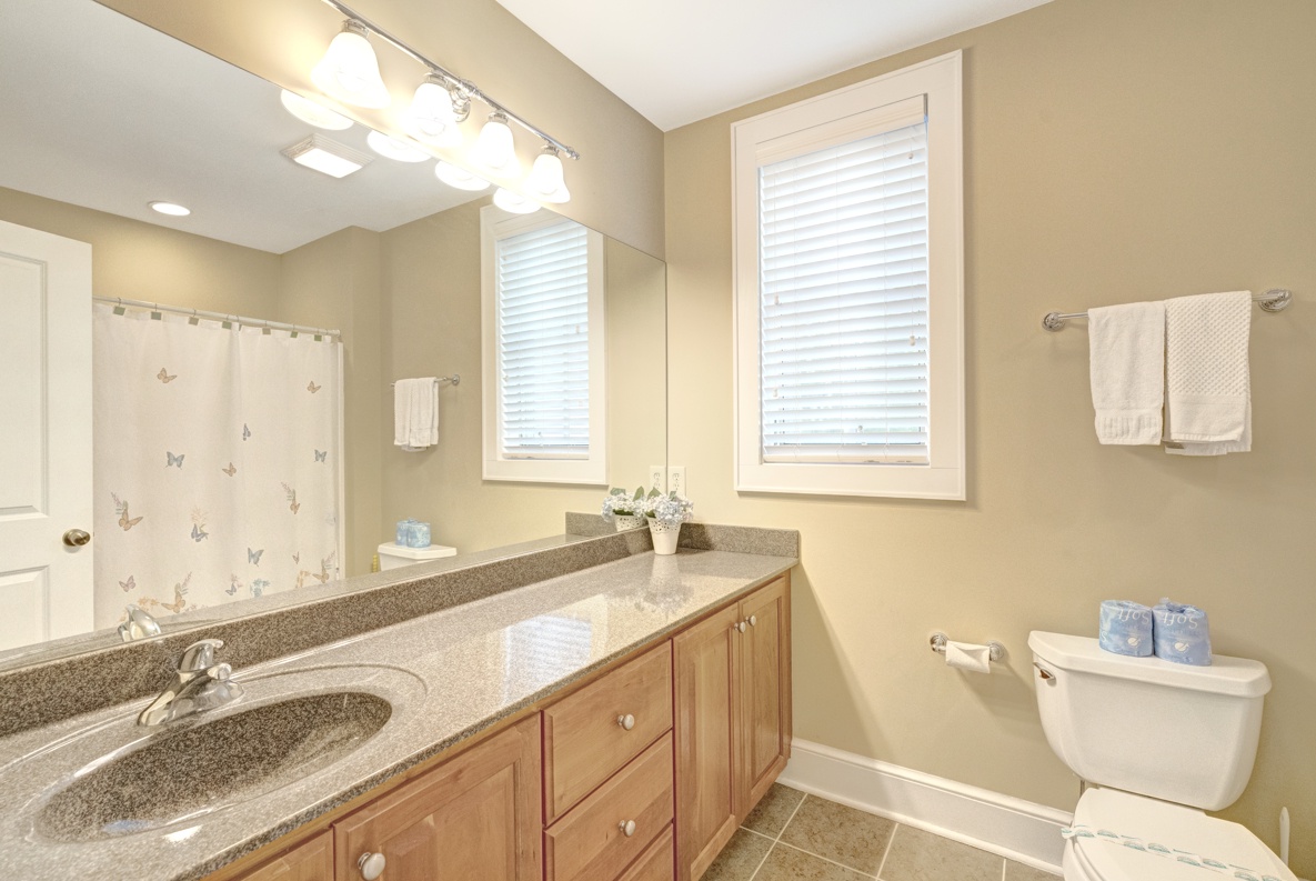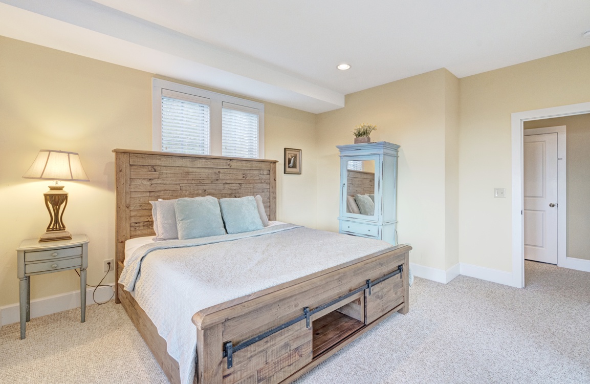 The upper level hosts two bedrooms sharing a Jack and Jill full bath – one with a king-size bed and the other with a queen bed.