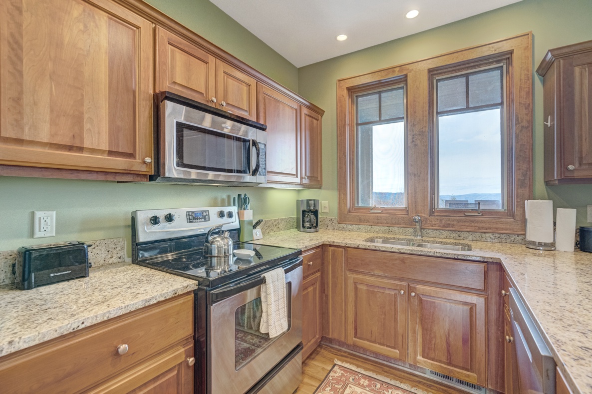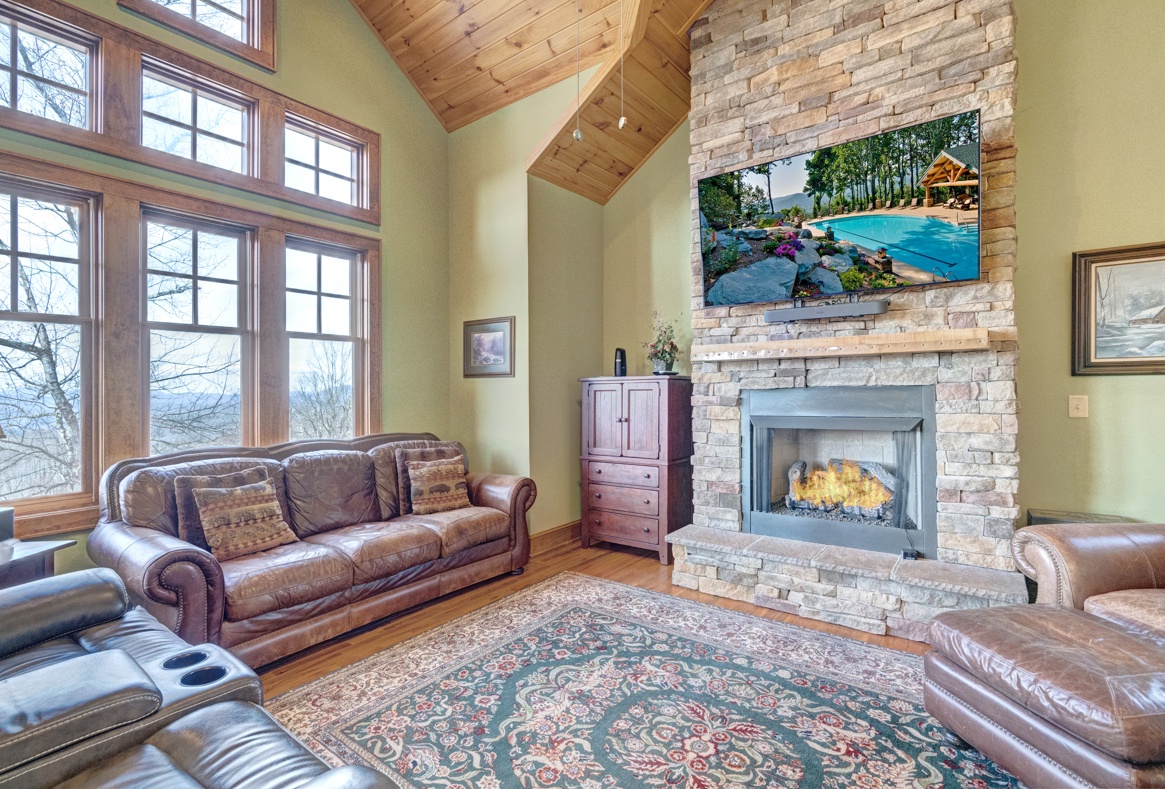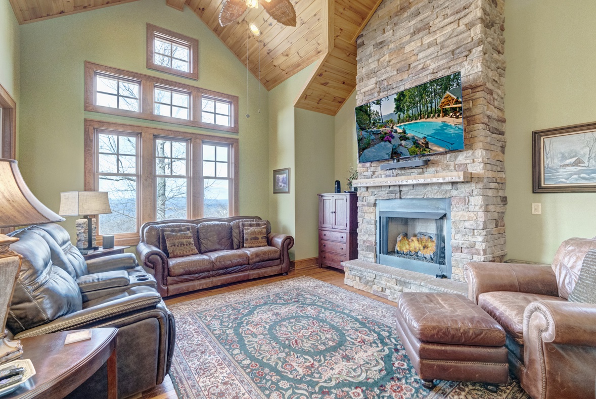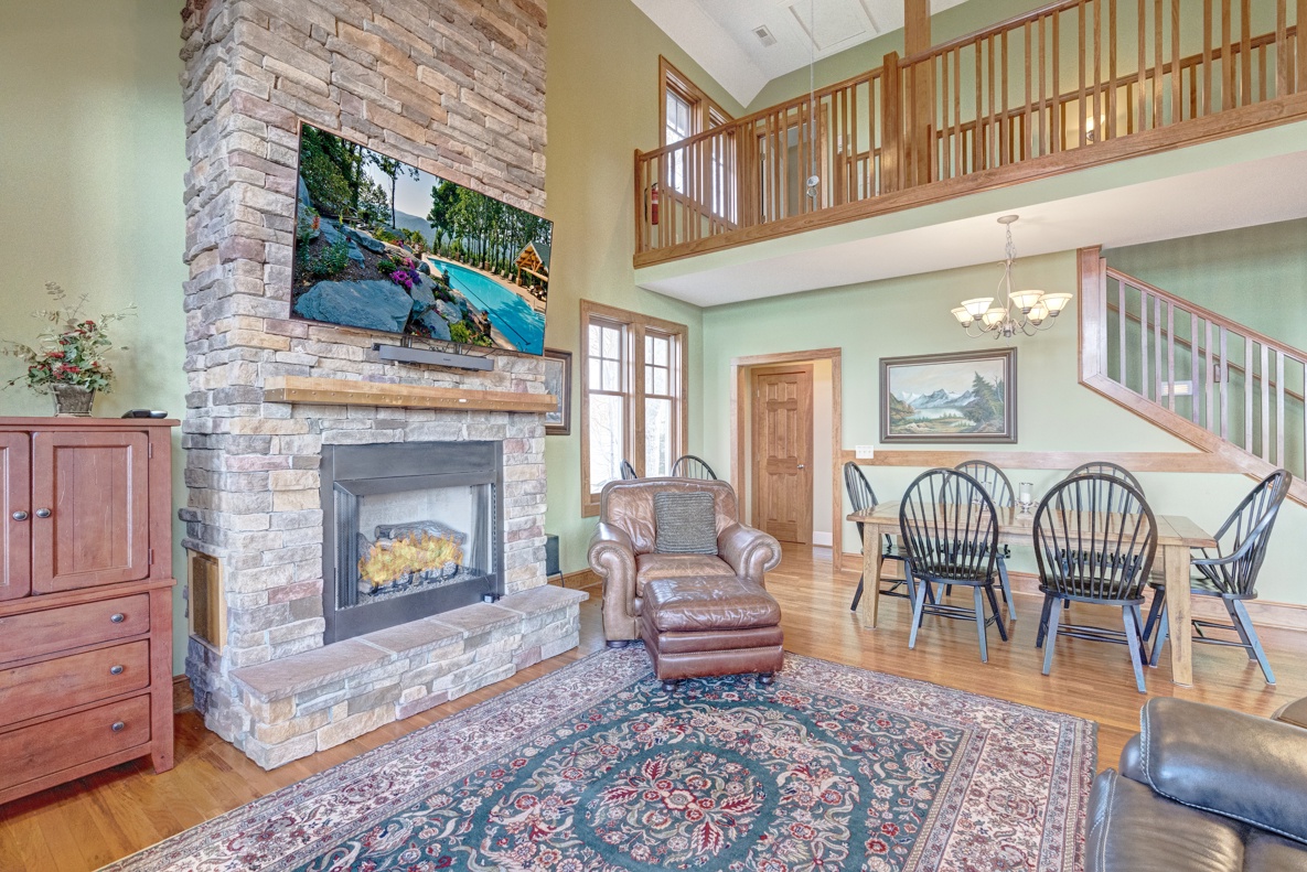 The main floor showcases a primary bedroom suite, a fully stocked kitchen with granite countertops, a Great Room, and an outdoor deck. The kitchen, equipped with glassware, plates, bowls, cups, utensils, pots, and pans, includes modern appliances like a dishwasher, electric range/oven, refrigerator, and microwave. The 2-story great room and dining area feature a full wall of glass windows framing spectacular mountain views. Cozy up by the beautiful stone fireplace with propane logs in the great room, where a 65” 4k HD Roku TV with Spectrum cable awaits. The dining area boasts a large farm table for 8 (expandable to 10), and there's a convenient half bathroom on this level. The primary bedroom suite offers a king-size bed, a 43” Roku HD TV with Spectrum cable, jacuzzi bath, and a separate shower. The main deck beckons with a propane grill and seating for 8.