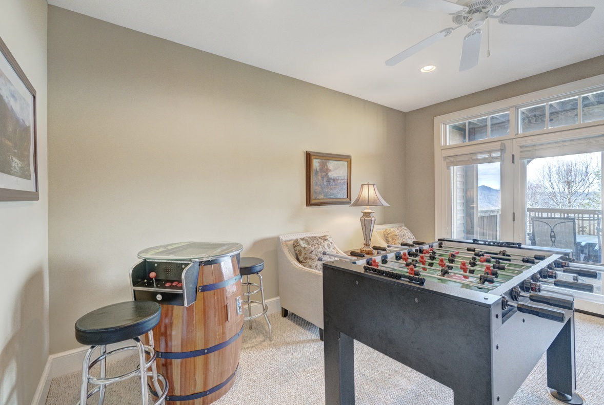 The lower level transforms into a game room, featuring a foosball table, barrel arcade table with over 300 loaded games, and a 65” HD TV with Spectrum. A queen-size Murphy bed provides additional sleeping space. Another primary suite on this level opens to the lower deck, offering a king-size bed and a full bathroom. The lower deck is perfect for relaxation, featuring a propane fire pit and seating for 6, all while enjoying the stunning mountain views.