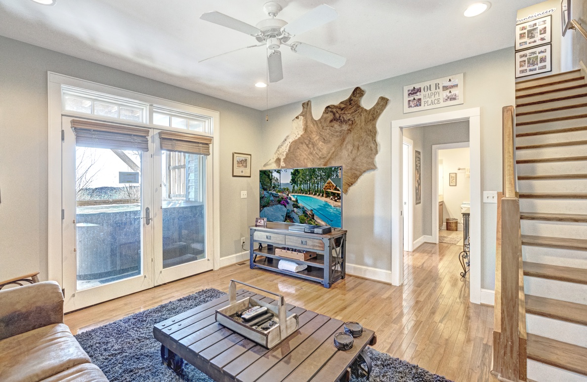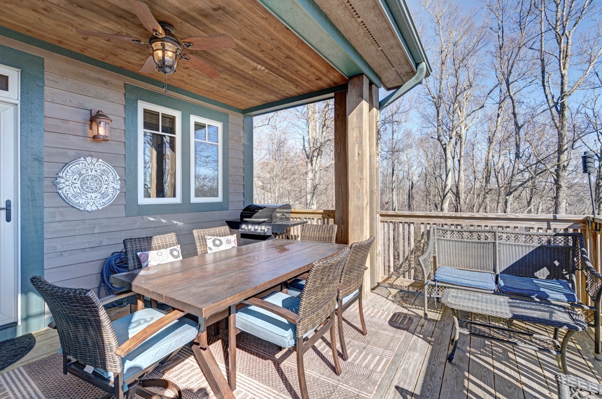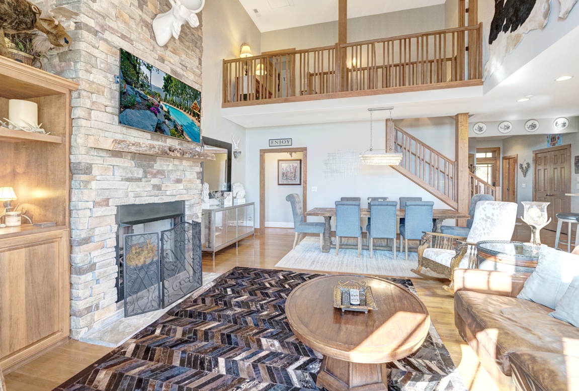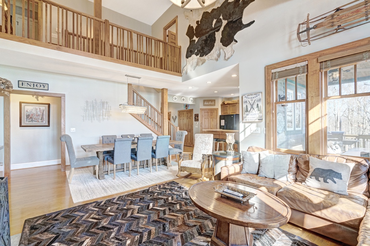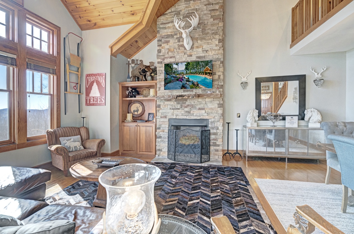 The great room, anchored by a stone fireplace, sets a cozy atmosphere. Curl up with a book by the fire or enjoy entertainment on the 54” flat-screen Smart TV. Stay connected with WIFI internet, and dine in style with our seating for 6. Our fully equipped kitchen invites culinary adventures, complemented by a large propane grill on the balcony. For those preferring take-out, local restaurants are just a short distance away.
