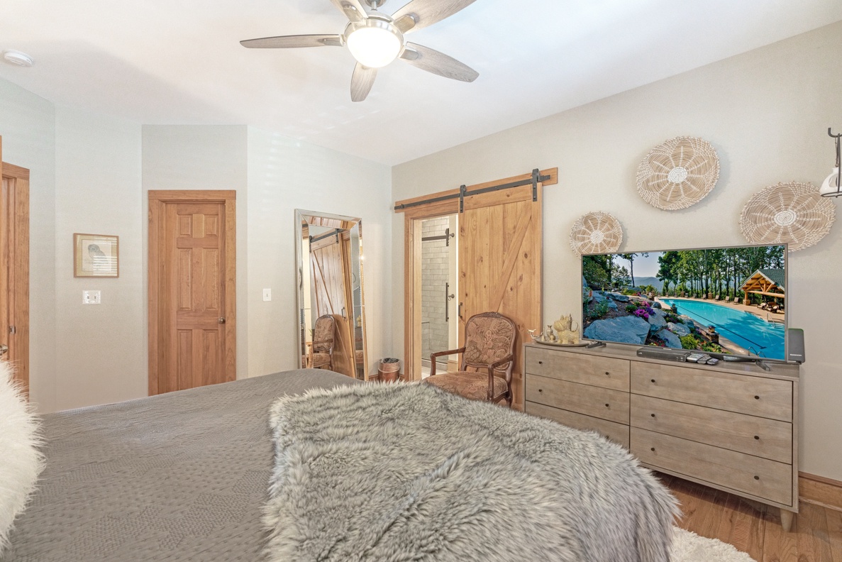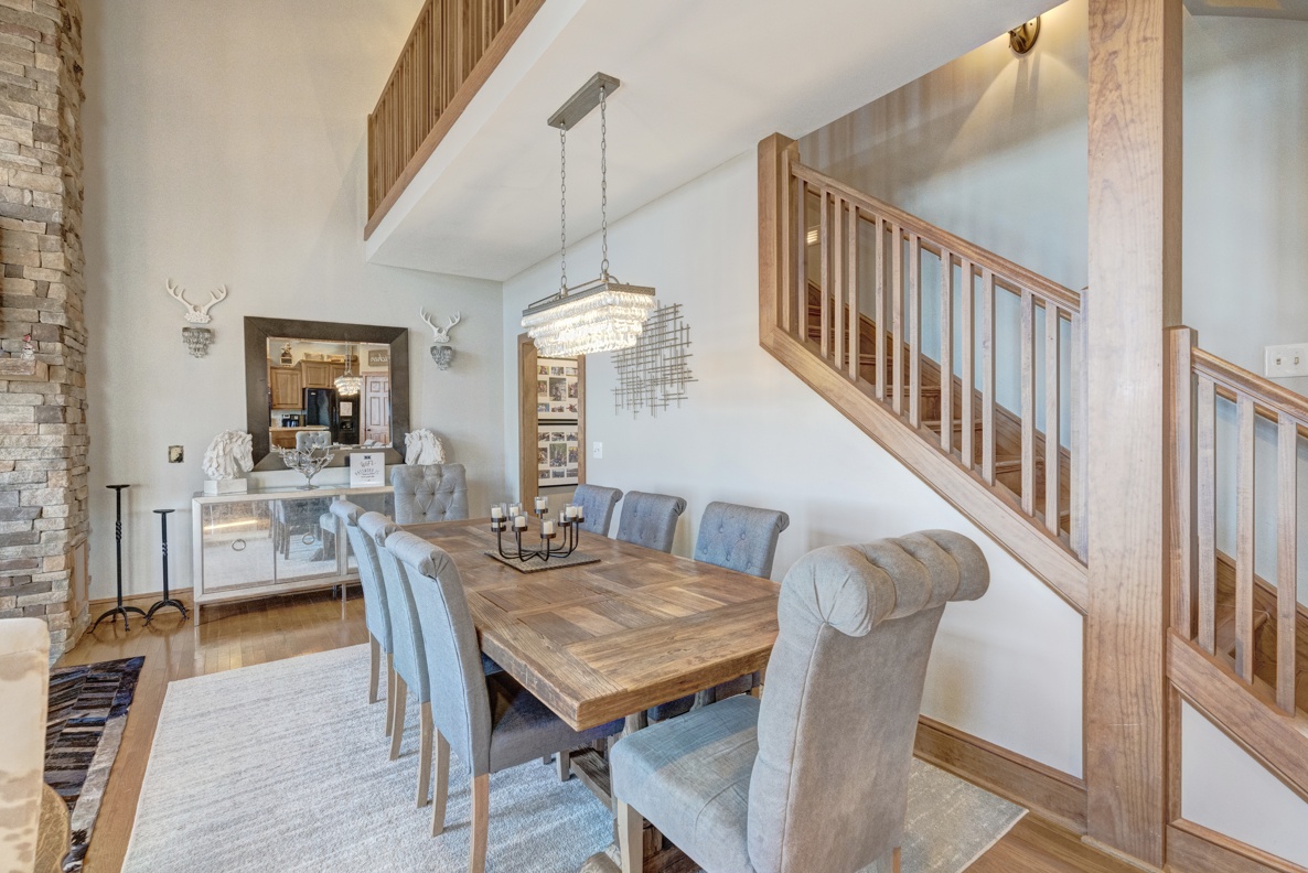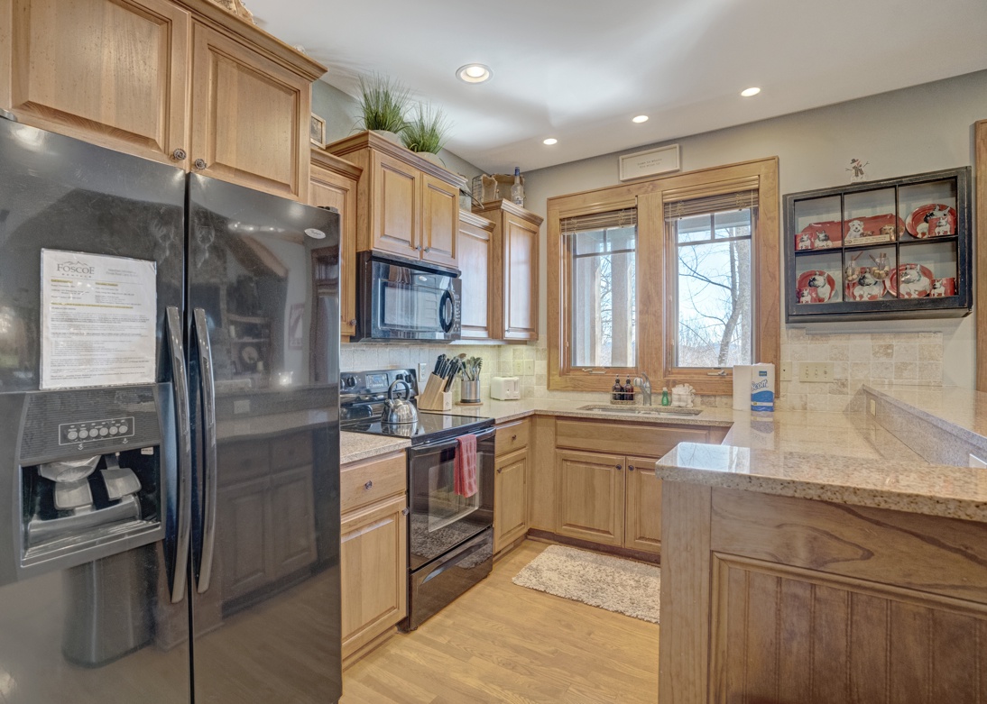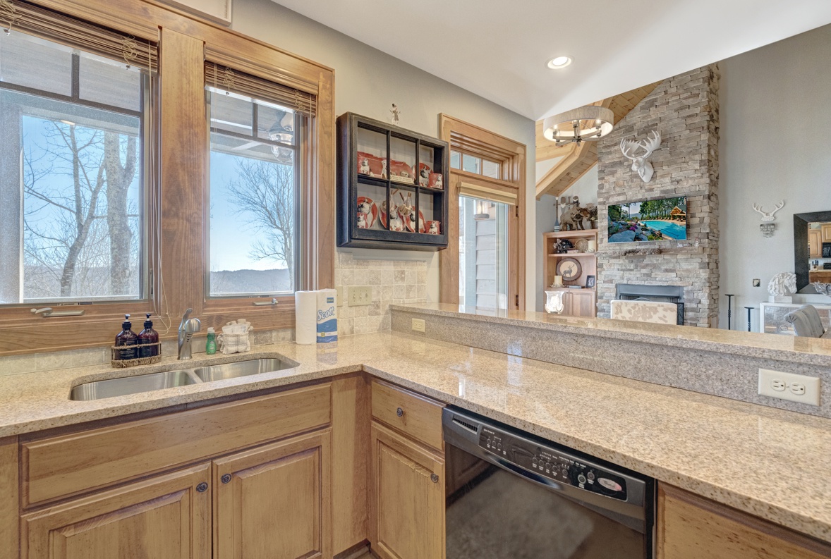 The great room, anchored by a stone fireplace, sets a cozy atmosphere. Curl up with a book by the fire or enjoy entertainment on the 54” flat-screen Smart TV. Stay connected with WIFI internet, and dine in style with our seating for 6. Our fully equipped kitchen invites culinary adventures, complemented by a large propane grill on the balcony. For those preferring take-out, local restaurants are just a short distance away.