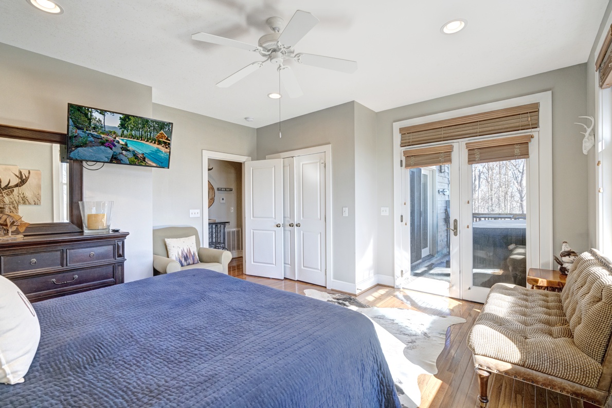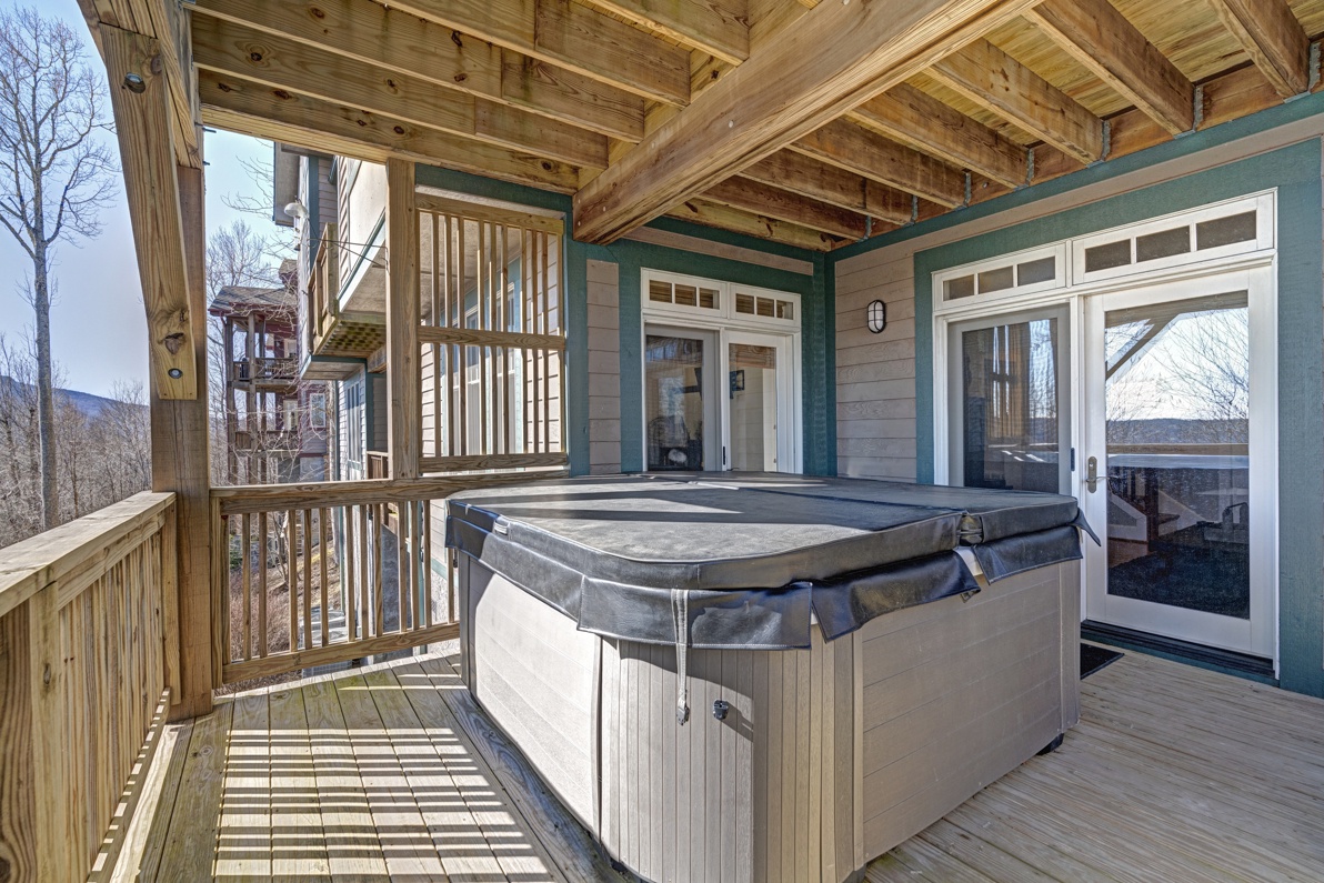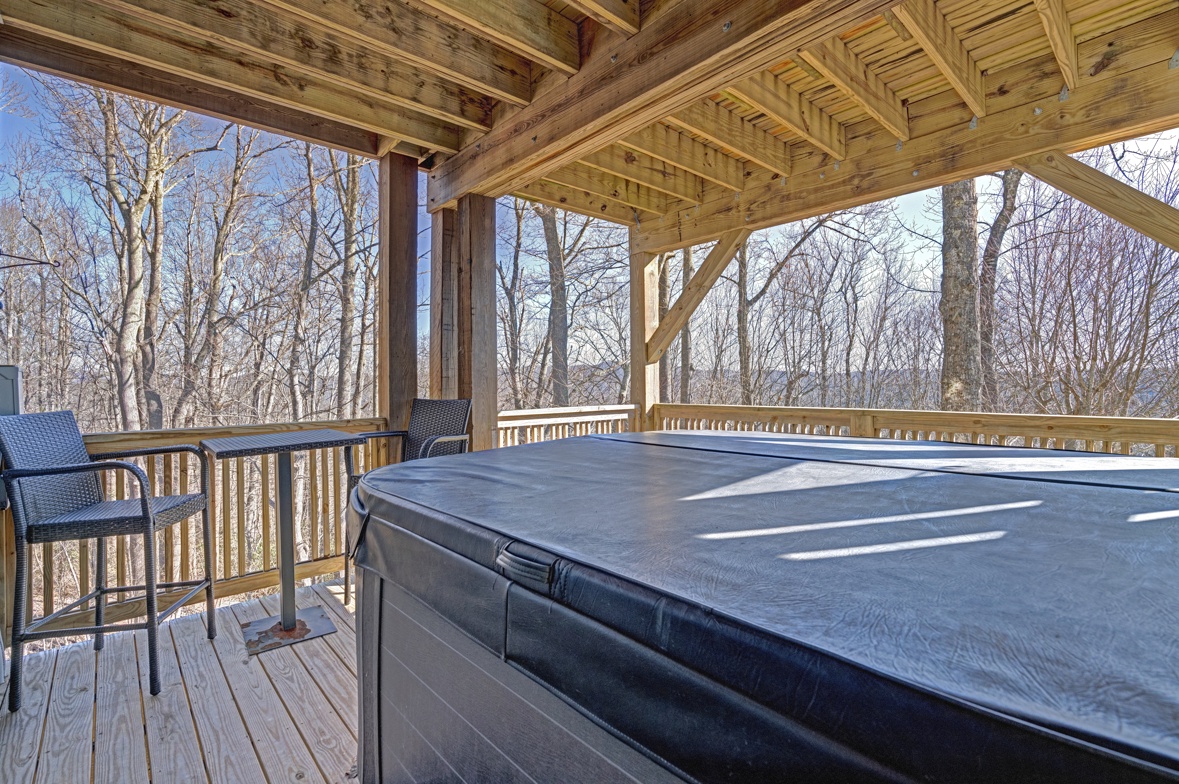 The lower level offers a relaxing sitting area with a futon and large flat-screen smart TV for movie nights. Another Primary Retreat awaits, featuring a King size bed, smart TV with access to Netflix, Amazon, and Xumo, plus a comfortable sitting area. Venture onto the lower deck to discover the highlight of our retreat – THE BIG JACUZZI, accommodating 89 comfortably. Whether it's watching the snowfall or leaves change color, this is the perfect spot to unwind with friends.