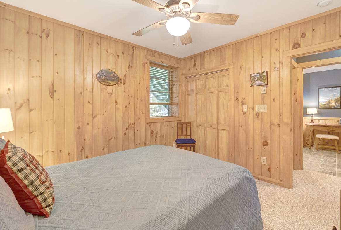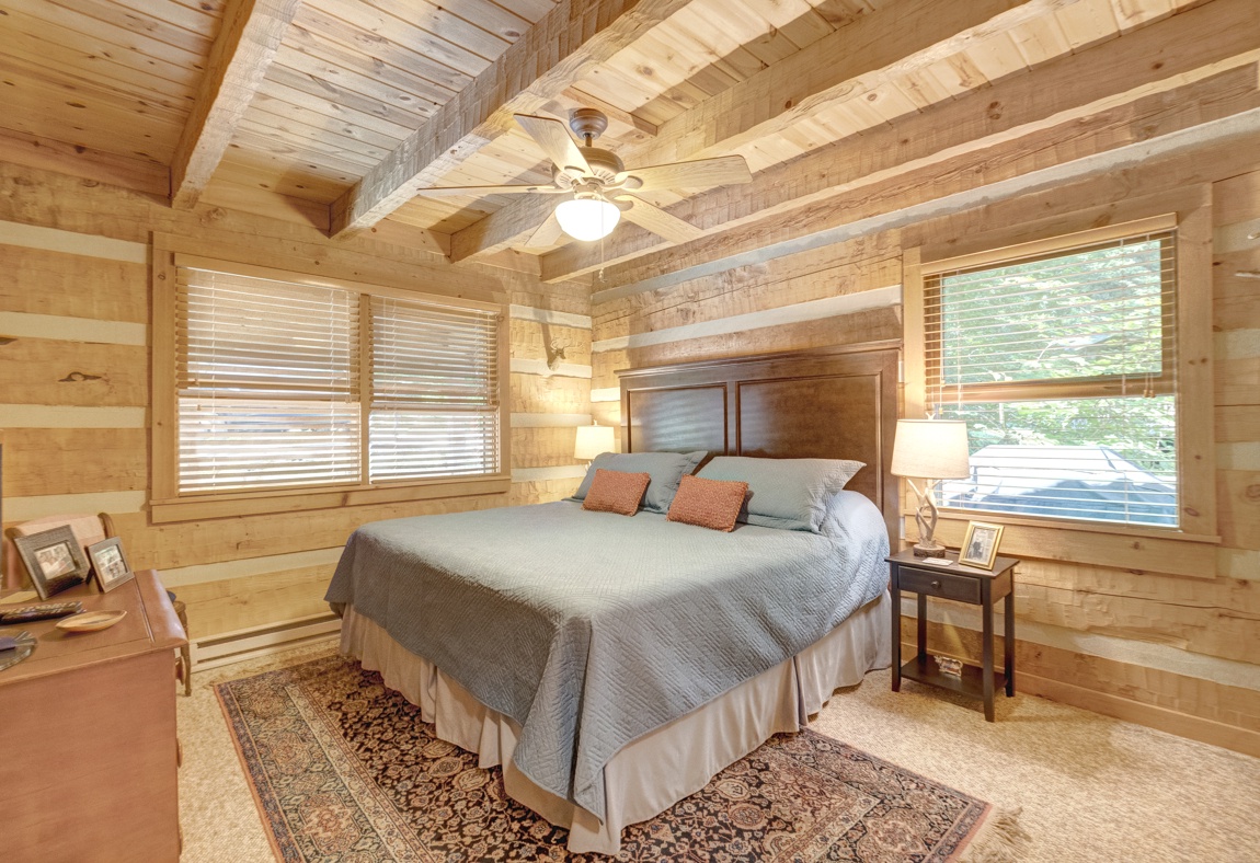 There are just three steps from the level parking area in front of the cabin to the front porch. The main level includes a great room with a soaring stone wood-burning fireplace and cathedral ceiling. (firewood only provided in winter months) The dining area is adjacent to the kitchen and connects to the screened porch via French doors. The amply appointed kitchen has an island with barstools, and plenty of kitchen implements for the avid cook, including an immersion blender, chocolate fondue pot, crockpot, and coffee grinder, a single serve Keurig and a wooden high chair for the little ones, and outdoor gas grill. There are four TVs, a Bose radio/CD player, and plenty of DVDs and games and puzzles (in the green chest in the main level great room).