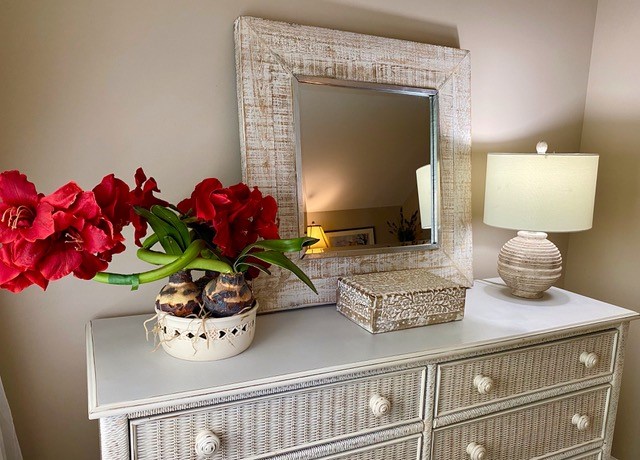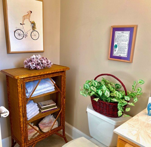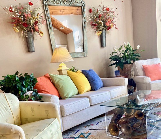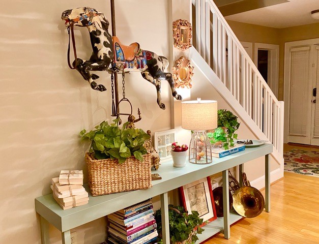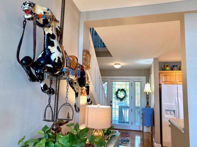 Owner has furnished this property with many items from her personal collection. An antique metal carousel horse from a child’s carousel in San Diego hangs from the ceiling. The thin eight-foot-long entry table features many unique items.Some guests say it is like going into an antique shop. Lots to look at.