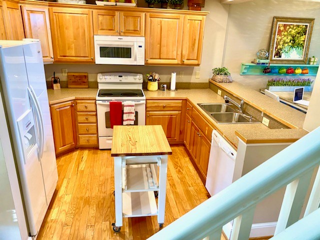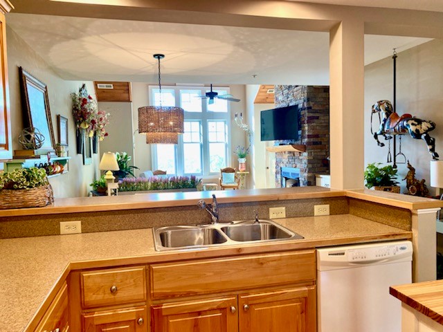 Spacious u-shaped kitchen and dining room also face the mountains. The small kitchen cart comes in handy when taking items out of the French door refrigerator. You can see the large, screen TV and fireplace from the sink, plus keep an eye on your guests. Door to the left of the fireplace leads to the private deck from the living room. No need to say “Hi” to your neighbors as you will barely see them.