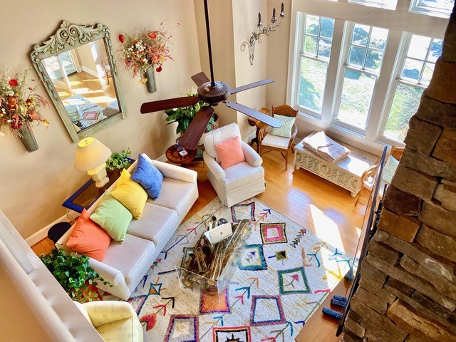 The focal point is the dramatic two-story windows overlooking Grandfather Mountain. They pop out the minute you enter. Couch is angled enough to take in that view as well as the fireplace. Soaring stone chimney stops at the cathedral ceiling.The living room coffee table is packed with an old brass instrument collection.Great conversation piece. Did you play in the band?