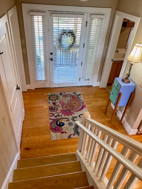 This floor plan is called a Cedar Woods. Entry to the unit is up seven steps from the sidewalk. There is another two-floor unit below. Glass front door and sidelights make for a spacious bright foyer. Door is flanked by two iron urns on the porch. Plenty of parking. Newly installed combination lock means no more fumbling for keys. To the right is a powder room and to the left is a handy laundry room complete with utility sink. It has three large bedrooms plus den with two and a half baths. Sleeps six in three queen-sized beds. Perfect for two to three adult couples.