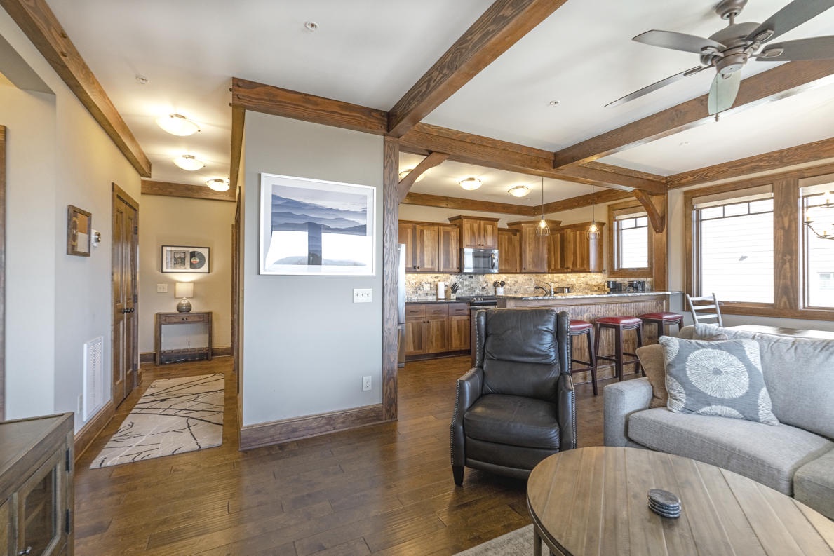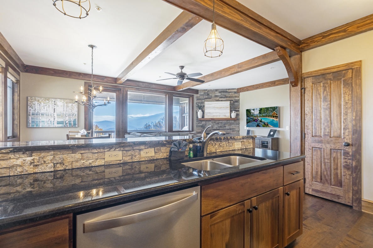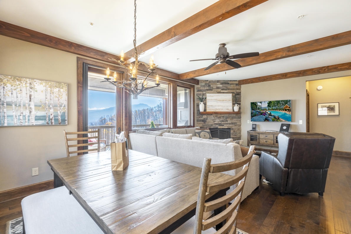 Description: Enjoy a beautiful view of the mountains from this rugged timber frame two-bedroom, two-bathroom bottom floor condo (stair access only). The mountain view can be admired from the deck or the large picture windows in the open kitchen, dining room, and living room areas. This condo is beautifully decorated to compliment the custom upgrades. The kitchen features upgraded cabinetry, granite countertops, hardwood floors and stainless-steel appliances and it is fully equipped to prepare a meal. The living room has a vaulted ceiling, cultured stone gas fireplace, hardwood floors, comfortable and cozy furniture, as well as a TV. The deck is thoughtfully equipped to enjoy outdoor living and dining with a built-in gas grill. Enjoy a short mountain getaway to relax inside or breathe in the fresh mountain air from the deck. If time allows, book for an extended stay and explore all the High Country has to offer.
