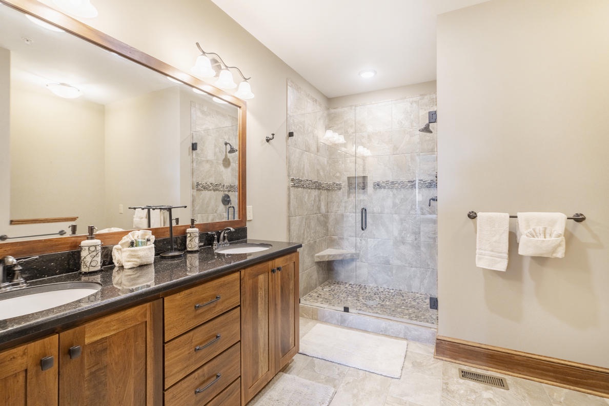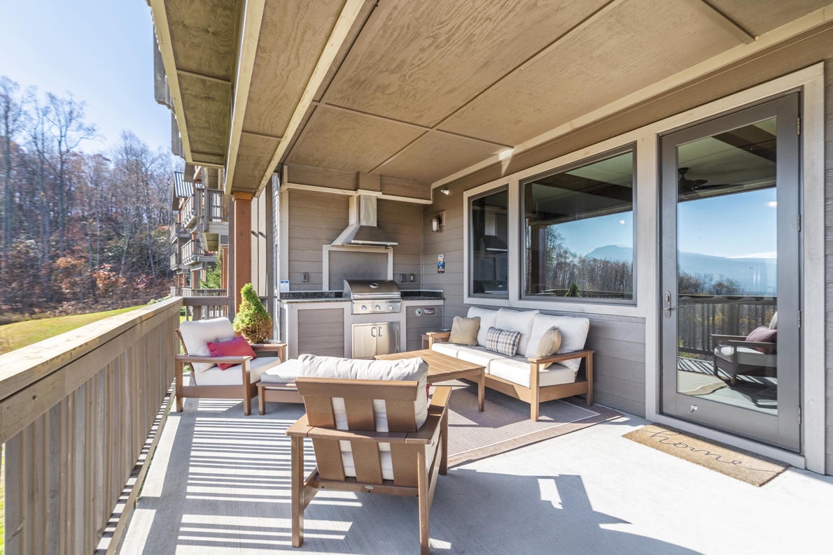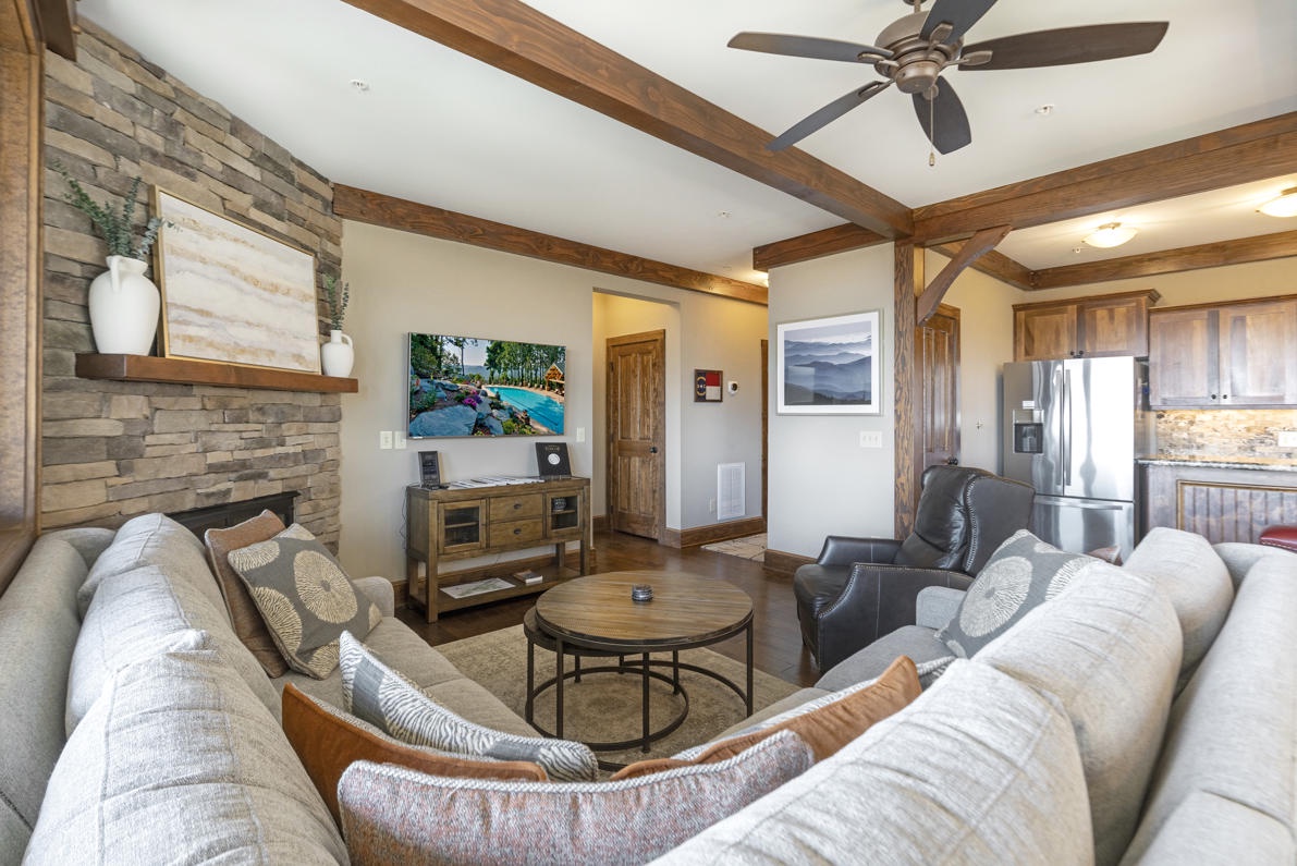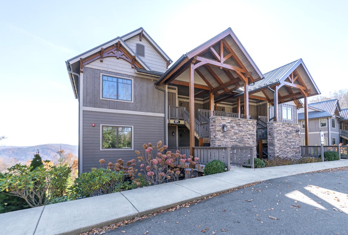 Description: Enjoy a beautiful view of the mountains from this rugged timber frame two-bedroom, two-bathroom bottom floor condo (stair access only). The mountain view can be admired from the deck or the large picture windows in the open kitchen, dining room, and living room areas. This condo is beautifully decorated to compliment the custom upgrades. The kitchen features upgraded cabinetry, granite countertops, hardwood floors and stainless-steel appliances and it is fully equipped to prepare a meal. The living room has a vaulted ceiling, cultured stone gas fireplace, hardwood floors, comfortable and cozy furniture, as well as a TV. The deck is thoughtfully equipped to enjoy outdoor living and dining with a built-in gas grill. Enjoy a short mountain getaway to relax inside or breathe in the fresh mountain air from the deck. If time allows, book for an extended stay and explore all the High Country has to offer.