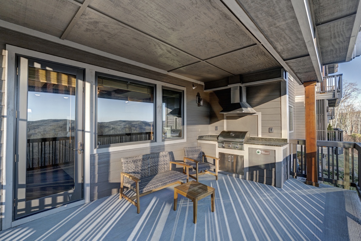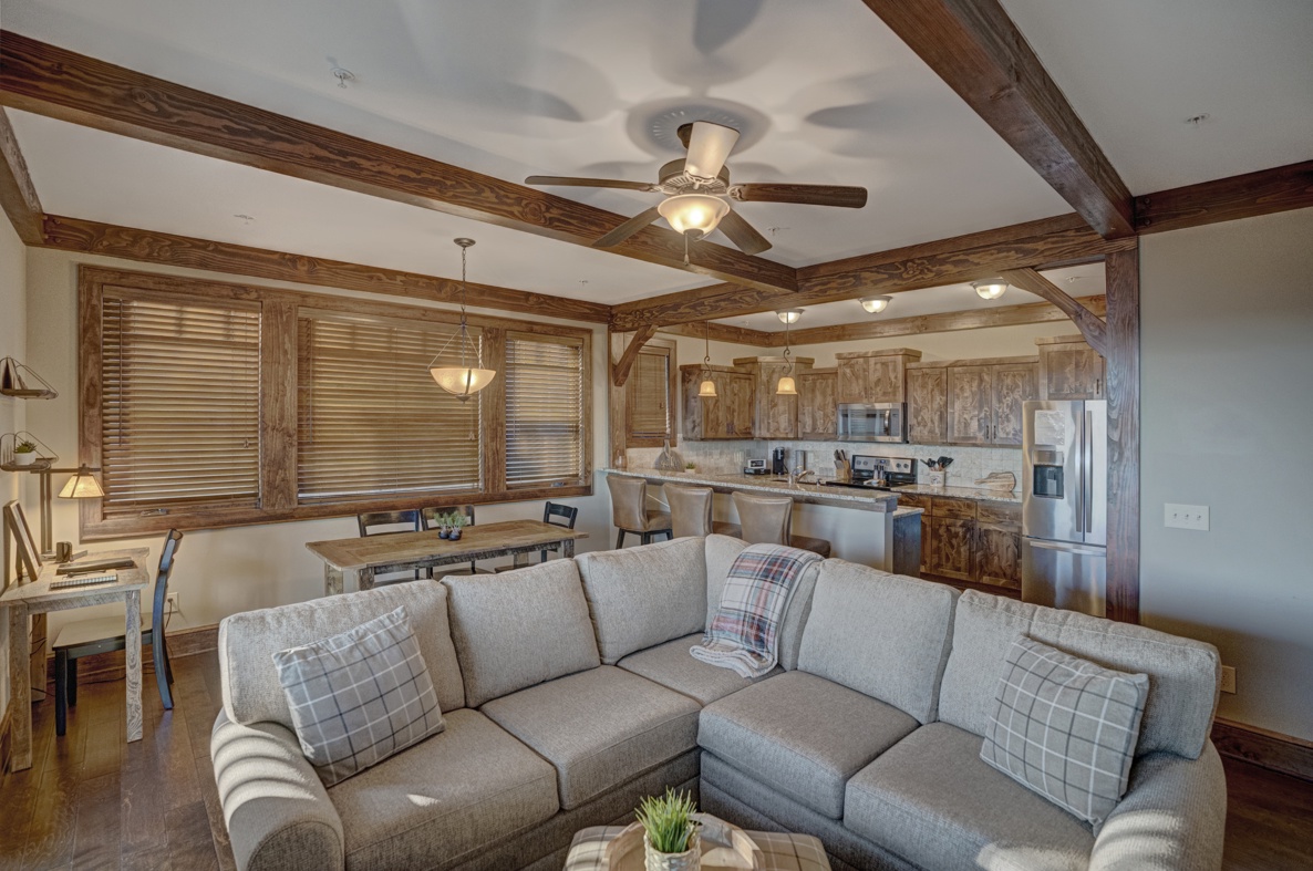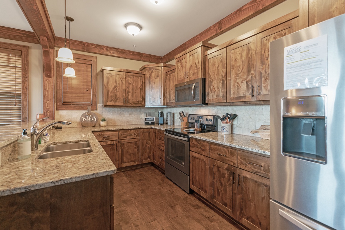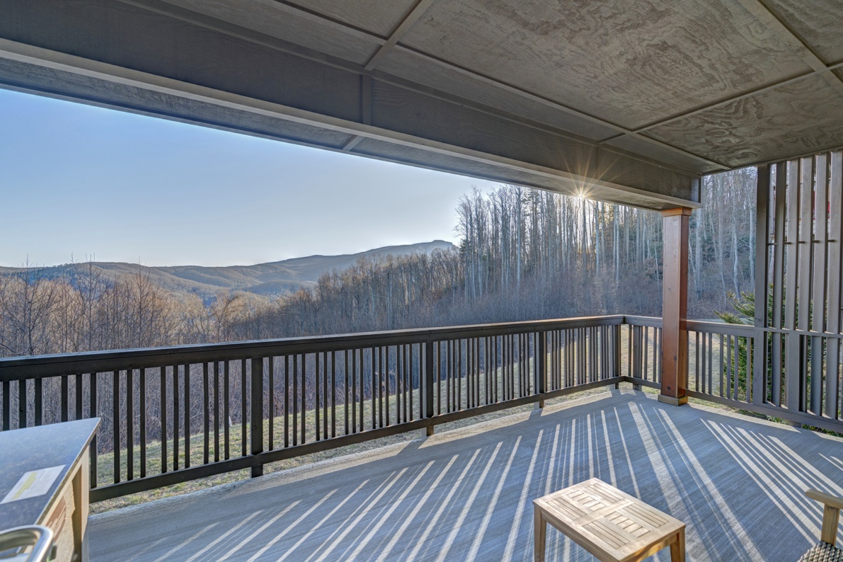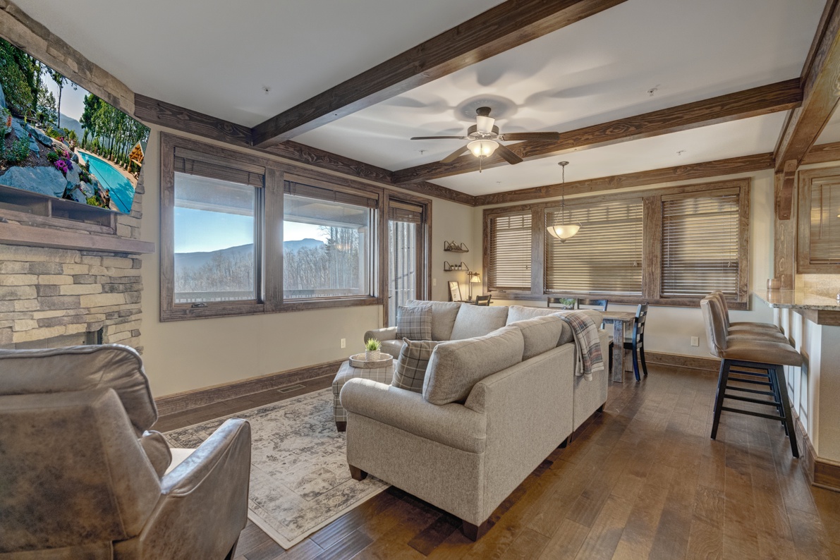 Description: Enjoy a beautiful view of the mountains from this rugged timber frame two-bedroom, two-bathroom bottom floor condo (stair access only). The mountain view can be admired from the deck or the large picture windows in the open kitchen, dining room, and living room areas. This condo is beautifully decorated to compliment the custom upgrades. The kitchen features upgraded cabinetry, granite countertops, hardwood floors and stainless-steel appliances and it is fully equipped to prepare a meal. The living room has a vaulted ceiling, cultured stone gas fireplace, hardwood floors, comfortable and cozy furniture, as well as a TV. The deck is thoughtfully equipped to enjoy outdoor living and dining with a built-in gas grill. Enjoy a short mountain getaway to relax inside or breathe in the fresh mountain air from the deck. If time allows, book for an extended stay and explore all the High Country has to offer.