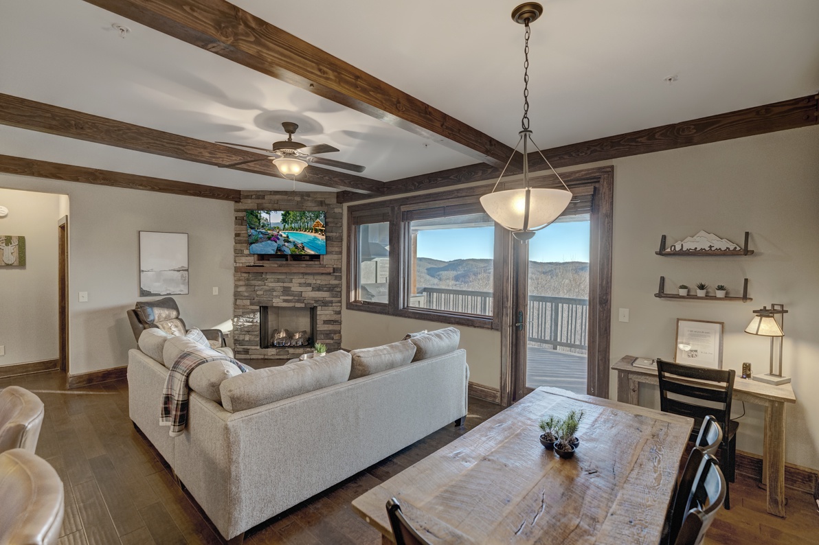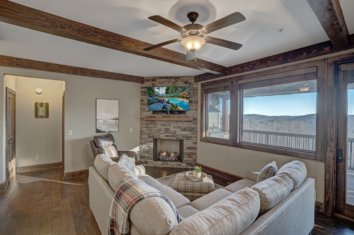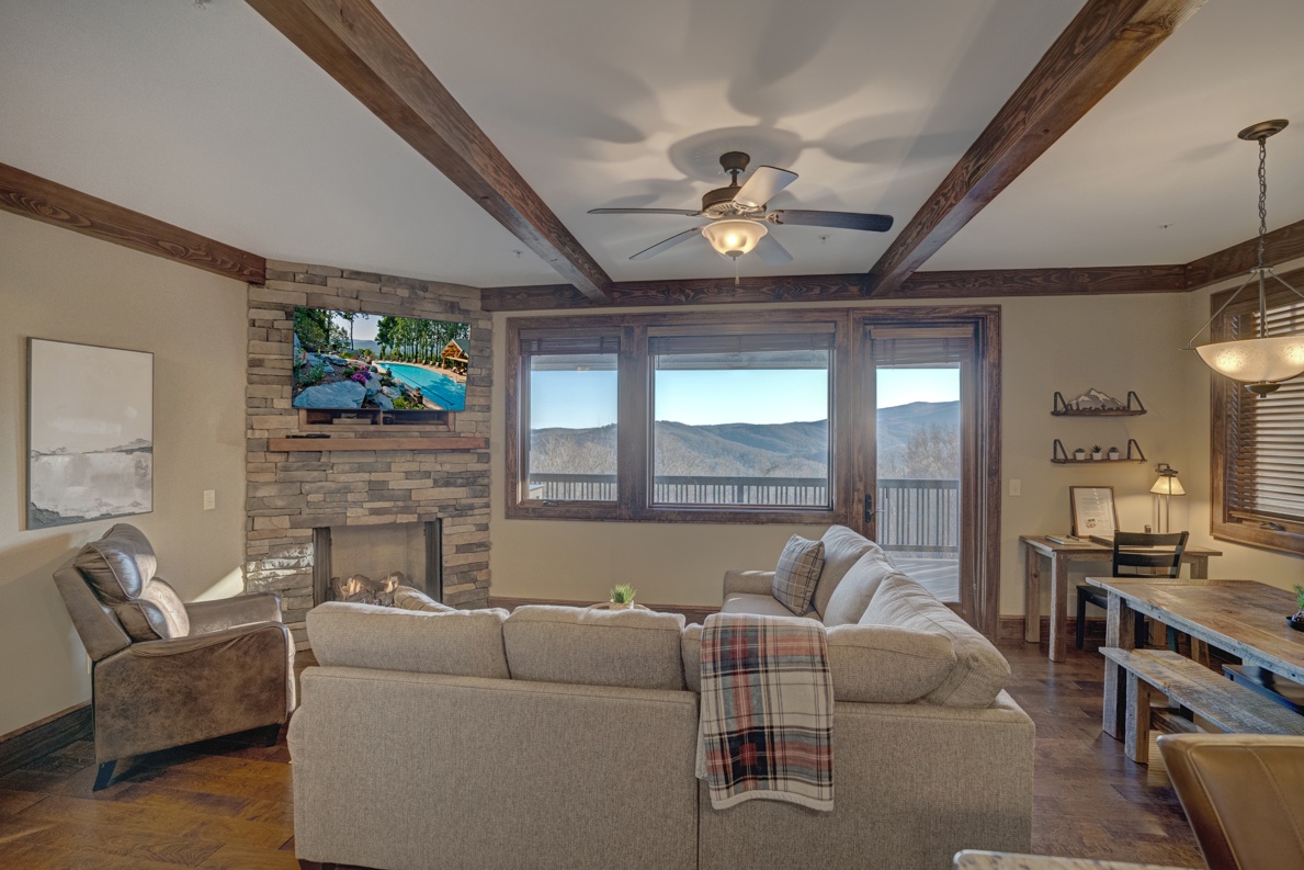 Living Room--- Cozy Fireplace, TV, Mountain View