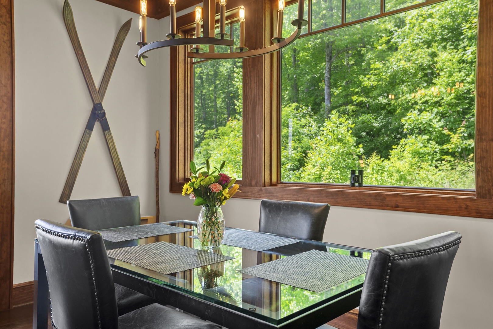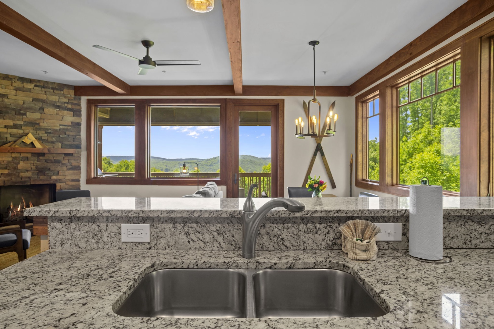 Description: Enjoy a beautiful view of the mountains from this rugged timber frame two-bedroom, two-bathroom bottom floor condo (stair access only). The mountain view can be admired from the deck or the large picture windows in the open kitchen, dining room, and living room areas. This condo is beautifully decorated to compliment the custom upgrades. The kitchen features upgraded cabinetry, granite countertops, hardwood floors and stainless-steel appliances and it is fully equipped to prepare a meal. The living room has a vaulted ceiling, cultured stone gas fireplace, hardwood floors, comfortable and cozy furniture, as well as a TV. The deck is thoughtfully equipped to enjoy outdoor living and dining with a built-in gas grill. Enjoy a short mountain getaway to relax inside or breathe in the fresh mountain air from the deck. If time allows, book for an extended stay and explore all the High Country has to offer.