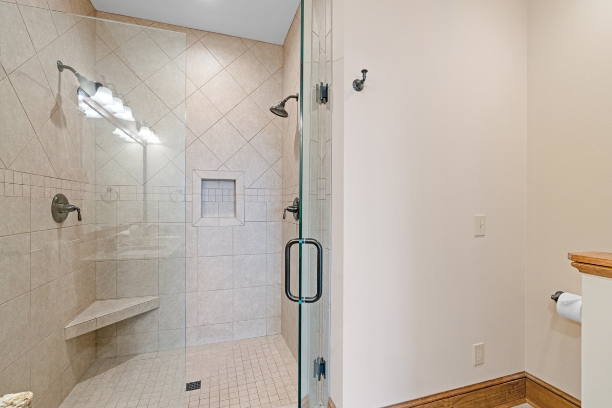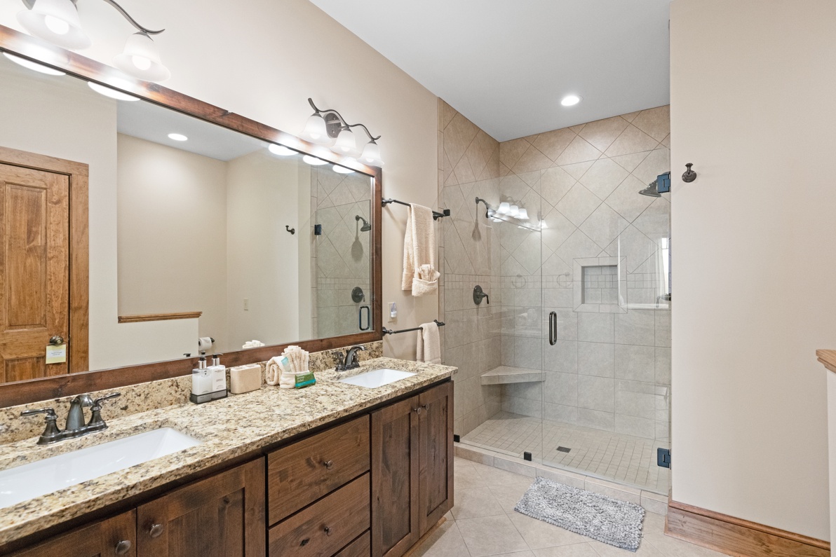 Primary Bathroom---Double Sinks, Tile Shower Stall