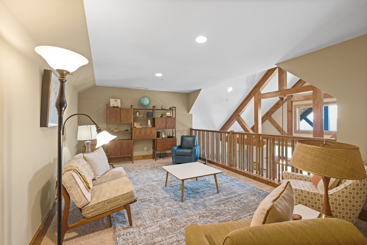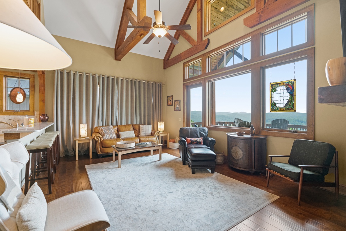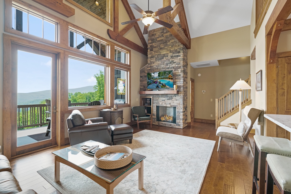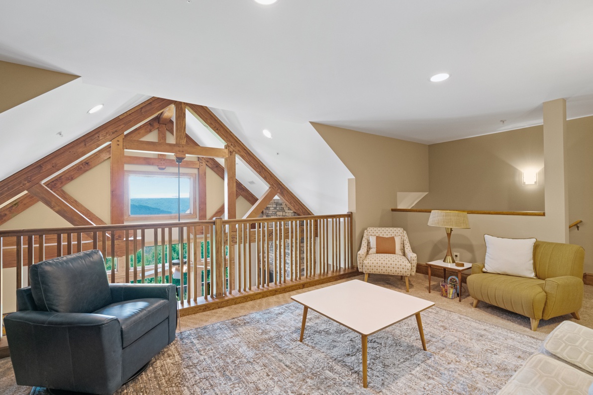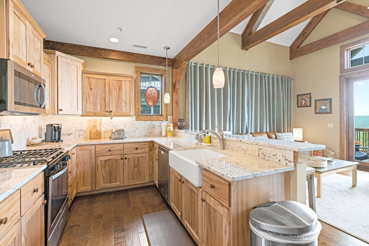 Description: Enjoy a beautiful view of the mountains from this rugged timber frame two bedroom, with loft, two-bathroom condo (upstairs, stair access only). The mountain view can be admired from the deck or the large picture windows in the open kitchen, dining room, and living room areas. This condo is beautifully decorated to compliment the custom upgrades. The kitchen features upgraded cabinetry, granite countertops, hardwood floors and stainless-steel appliances and it is fully equipped to prepare a meal. The living room has a vaulted ceiling, cultured stone gas fireplace, hardwood floors, comfortable and cozy furniture, as well as a TV. The deck is thoughtfully equipped to enjoy outdoor living and dining with a built-in gas grill. Enjoy a short mountain getaway to relax inside or breathe in the fresh mountain air from the deck. If time allows, book for an extended stay and explore all the High Country has to offer.